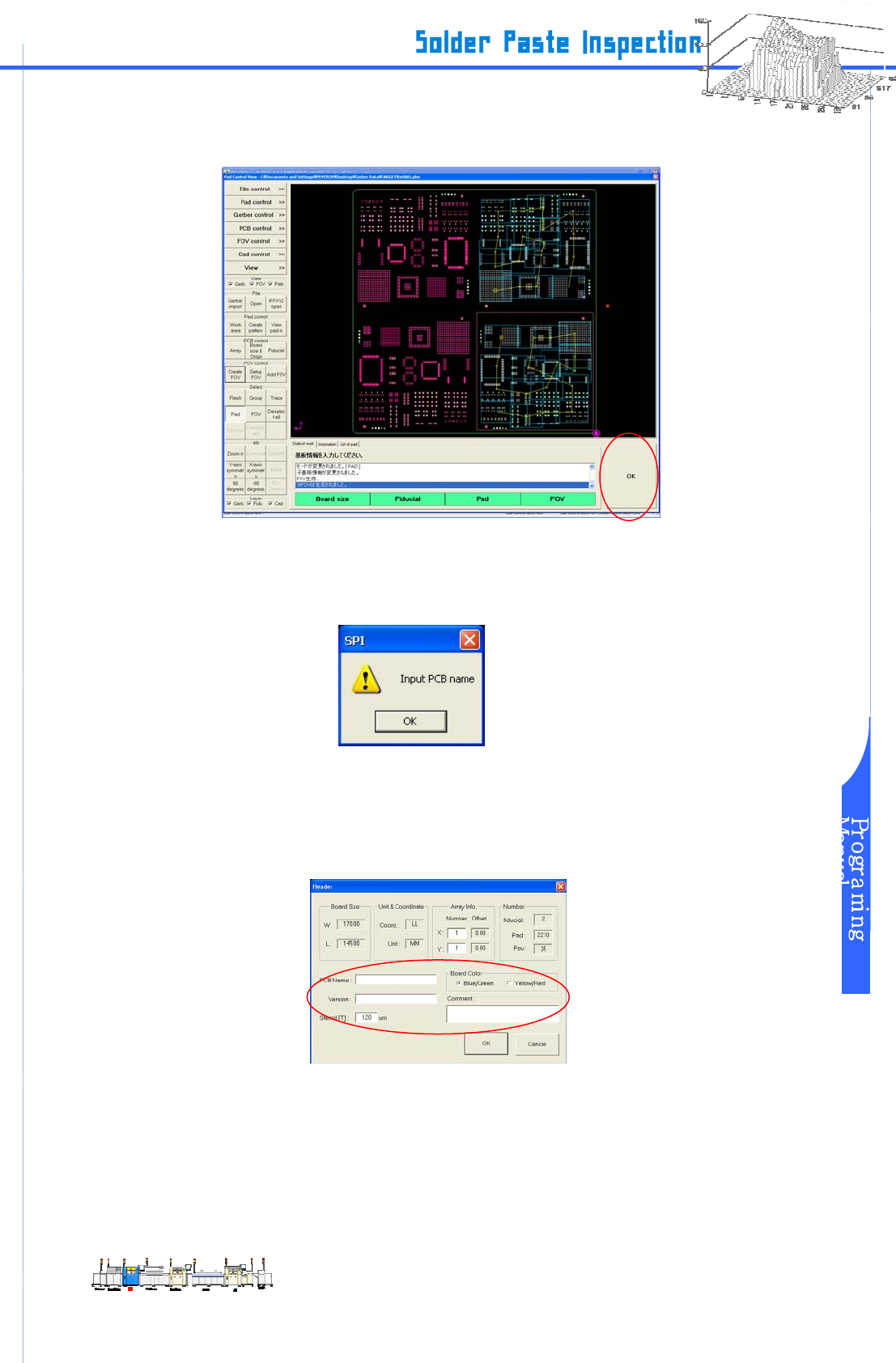 www.pemtron.com 39 步骤 22 : 在右下方窗口,请按 “ OK ” 键 。 图 III-5-17 FOV 安装 步骤 23 : 弹出 “Input PcbName” 对话框后,请按 “ OK ” 键 。 图 III-5-18 对话 框 步骤 24 : 在 Header 框里,输入 Group 名和 Board 名 后,请选择 Board 的颜色 “ Blue/Green ” 或 “ Y ellow/Red ” 。在 …