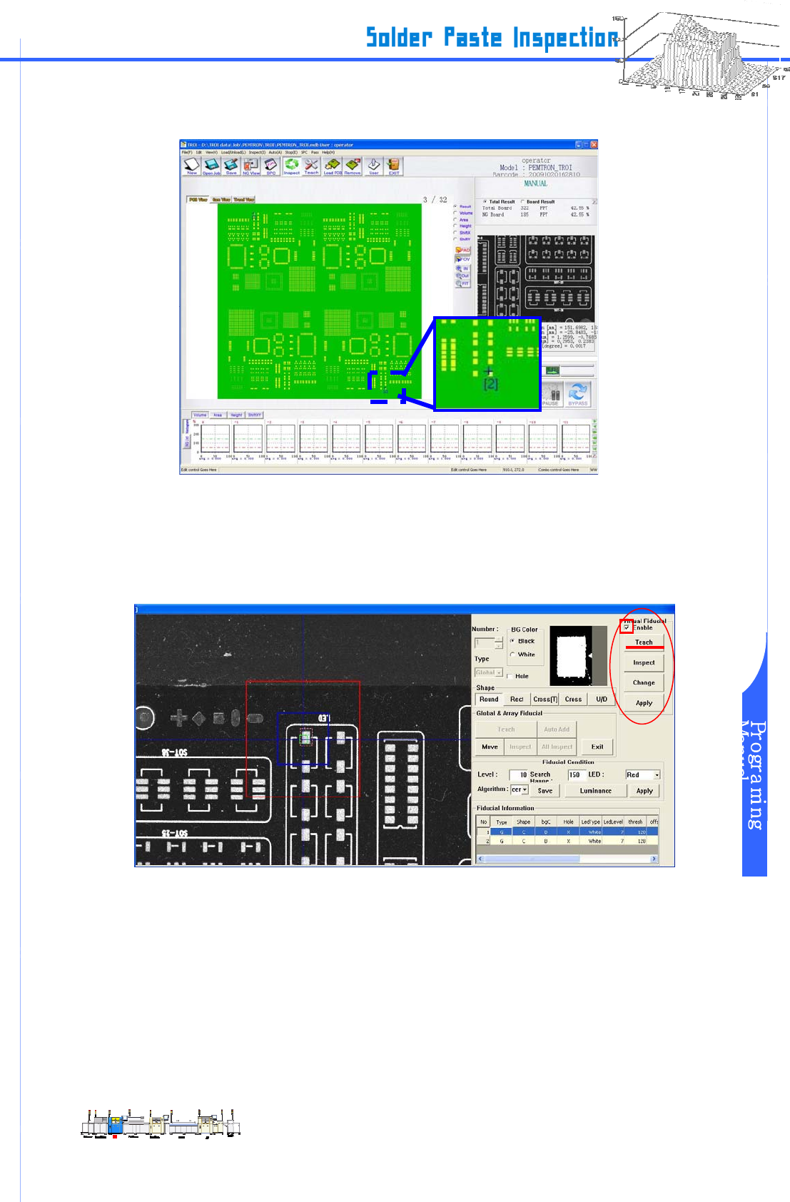 www.pemtron.com 42 编辑数据程序结束。 Figure III-6-3 Lay out window display 步骤 5 : 执行 III-2-6 PCB 载入程序 后,按 III-2-7 教程 打开框标设定窗口。然后,运行框标设置。导入 Gerber 数据时, 调节所有临时框标设置。 框标位置和亮度调节结束后, 点击菜单右边的 “ Vi r tu a l T each ing ” 键 ,运行 Fiducial M…