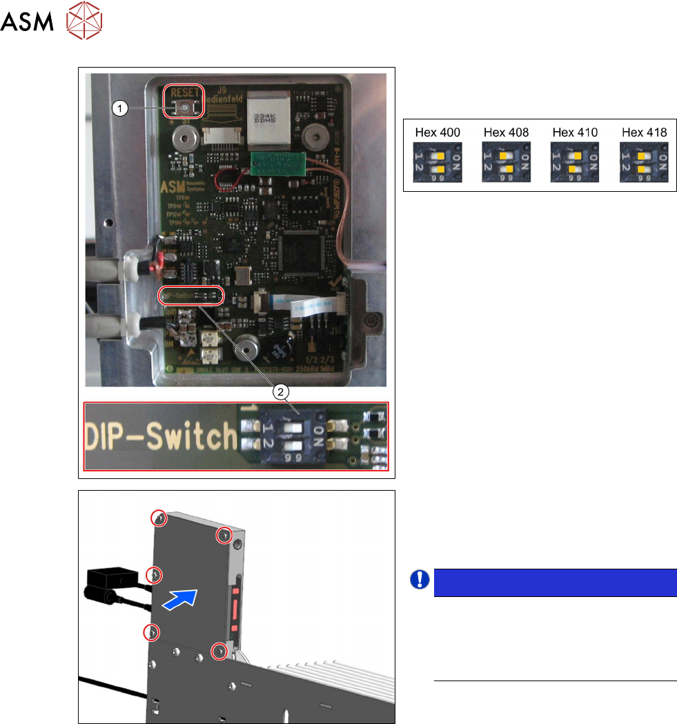5 CAN-ID Modus und Voreinstellungen 5.2 CAN-ID einstellen 28 User Manual / Bedienungsanleitung SIPLACE Single Slot Interface 05/2021 ► Stellen Sie am DIP-Schalter (2) die gewünschte CAN-ID ein. Folgende CAN-IDs sind mögl…