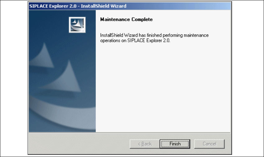 Installation and Configuration Guide SIPLACE Explorer 5 Deinstallation Edition 02/2005 EN 5.3 Repair 125 → SIPLACE Explorer 2.0 recovery has been completed. 5 Fig. 5 - 8 Repair complete → Click on Finish to close the SIP…