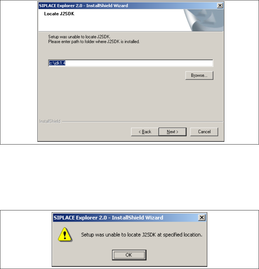 Fig. 3 - 17 SIPLACE Explorer setup - unable to locate J2SDK