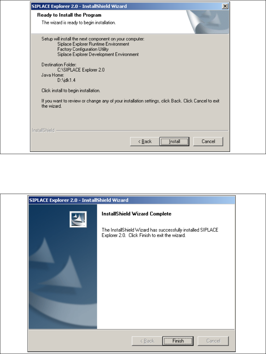 Installation and Configuration Guide SIPLAC E Explorer 3 Installing SIPLACE Explorer Edition 02/2005 EN 3.3 SIPLACE Explorer 2 .0 Installation 41 → Click on Finish . → SIPLACE Explorer can be started by selecting Program…