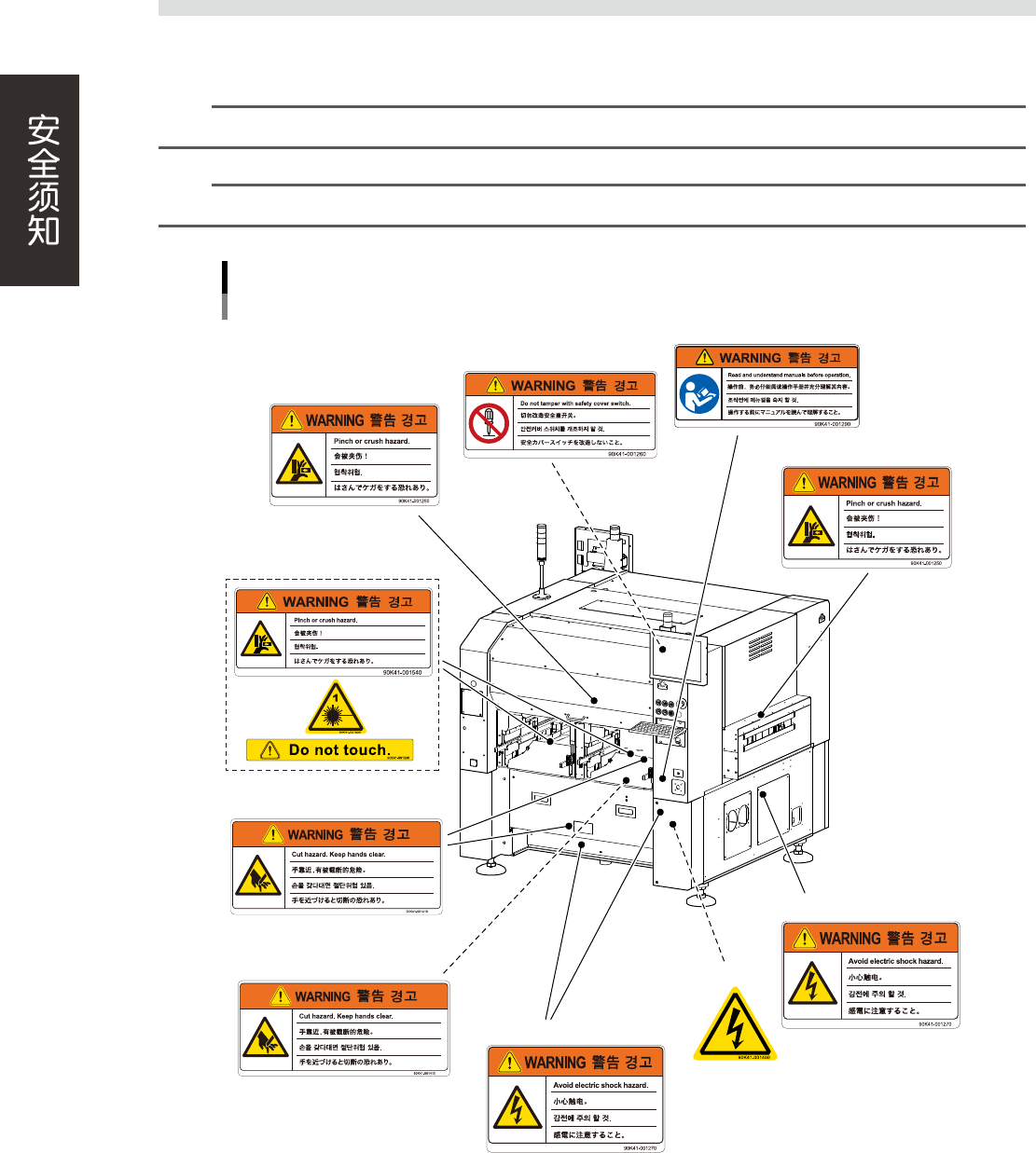 为了安全使用机器,如下图所示,在设备各个部位张贴了警告标贴,务必严格遵守标贴指示。此外,关于本节所
