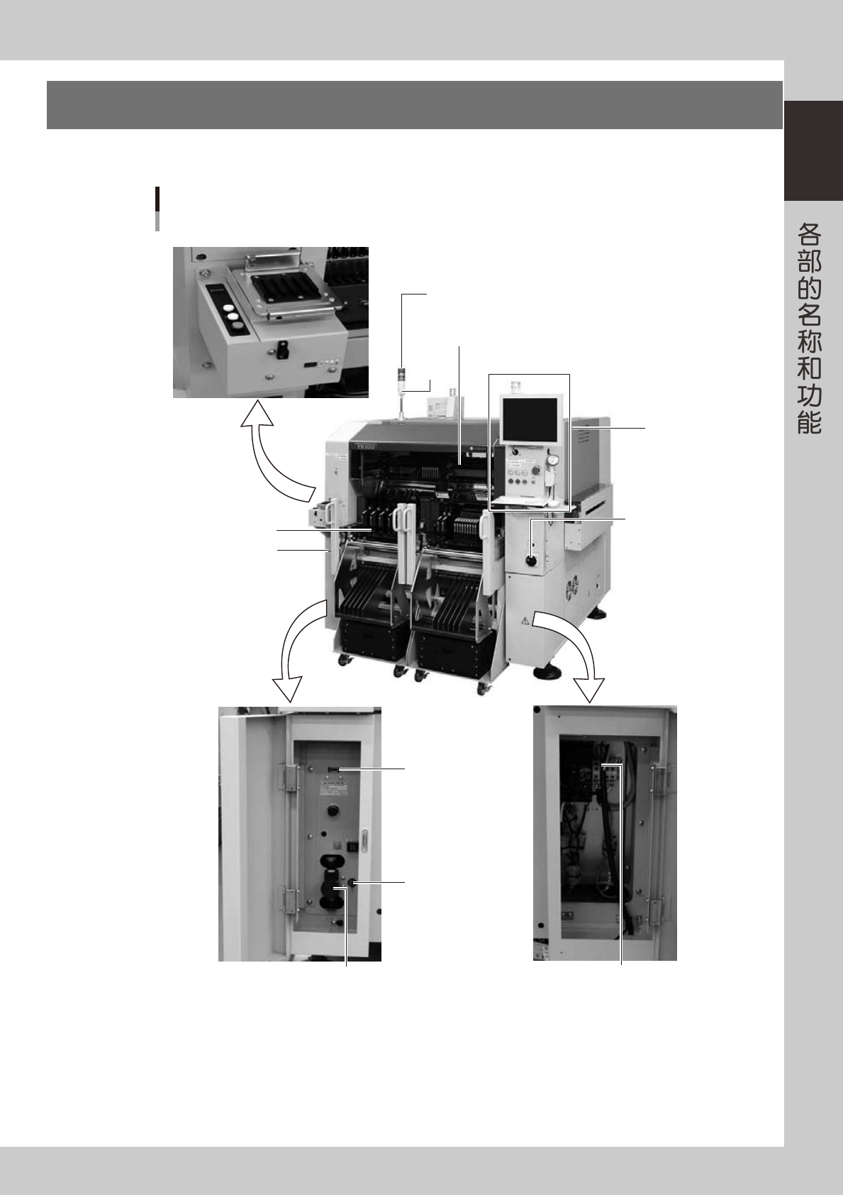 本章节,介绍贴片机主要部分的名称和功能。安装完毕的标准贴片机的构成,如下图所示。