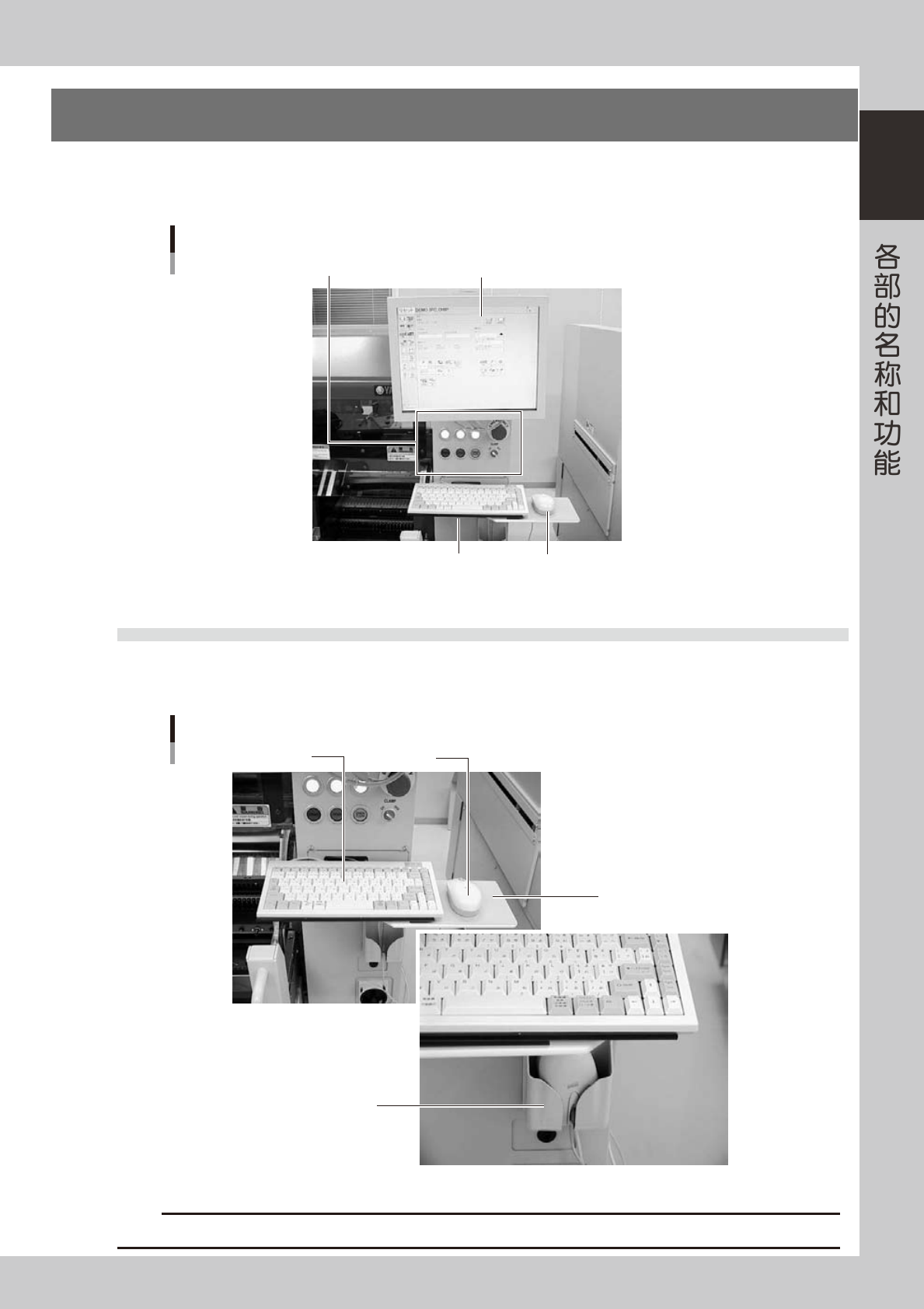 贴片机的正面和背面 ( 背面的为选配 ) 有操作机器、输入数据时使用的操作面板按钮、键盘、鼠标等装备。