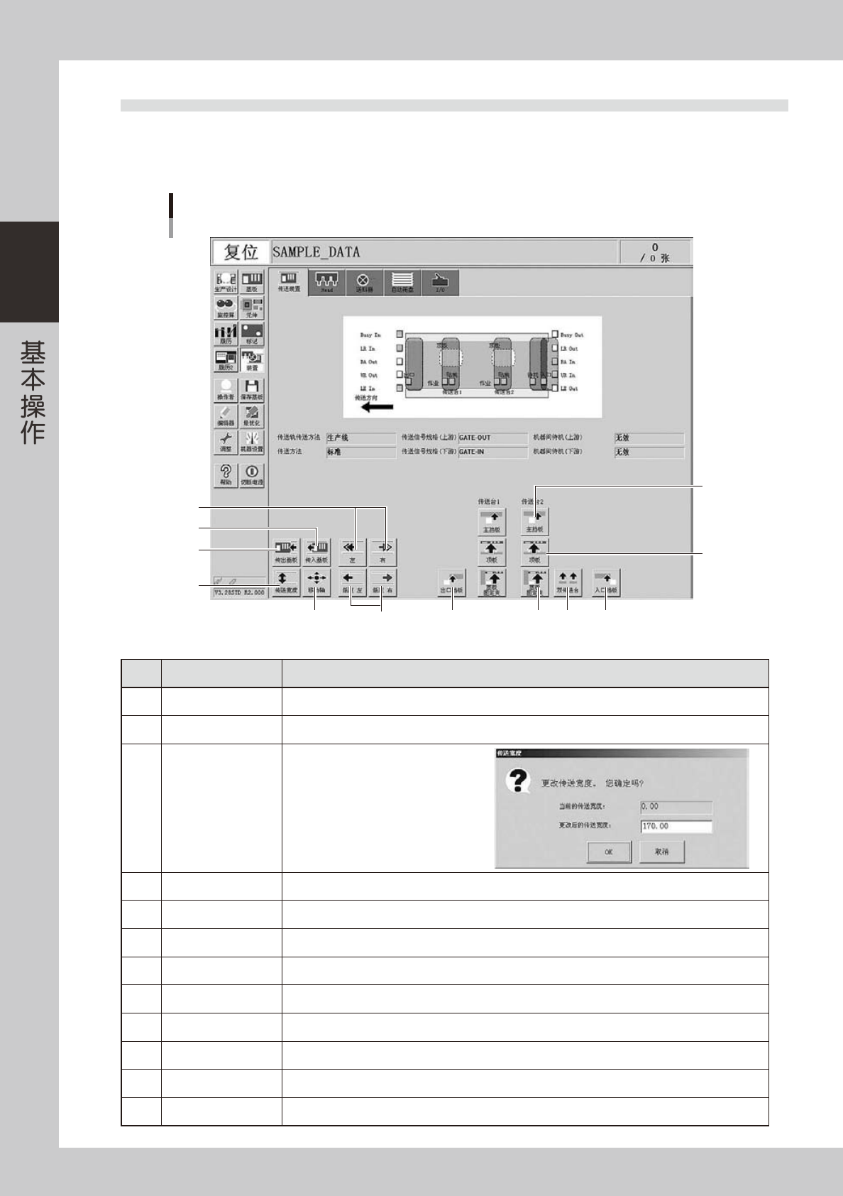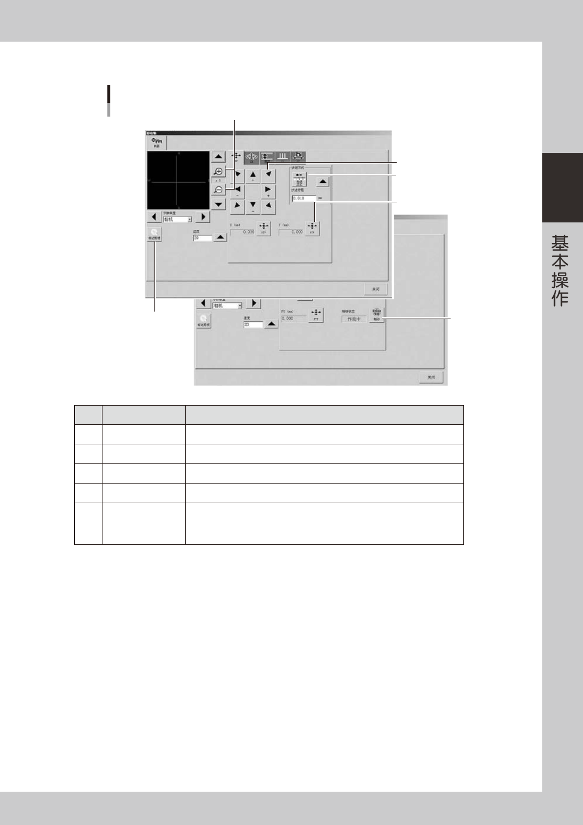 2-15 2 ■ 移动轴 「移动轴」画面 1 2 3 4 5 6 26206-L1-00 按钮名 功能 1 放大、缩小 ( +、- ) 放 大、 缩 小 图像 。 (16 倍 〜 1/16 倍 ) 2 标记照明 可 以 手动 方 式 更改 标 记 照明 。 不 影响 数 据。 3 PTP 对 象自 动 移 至指 定 坐标 。 4 步进方式 用 方 向按 钮 移 动步 进 行 程中 指 定 的量 。 5 方向按钮 要 移 至想 要 移 动…