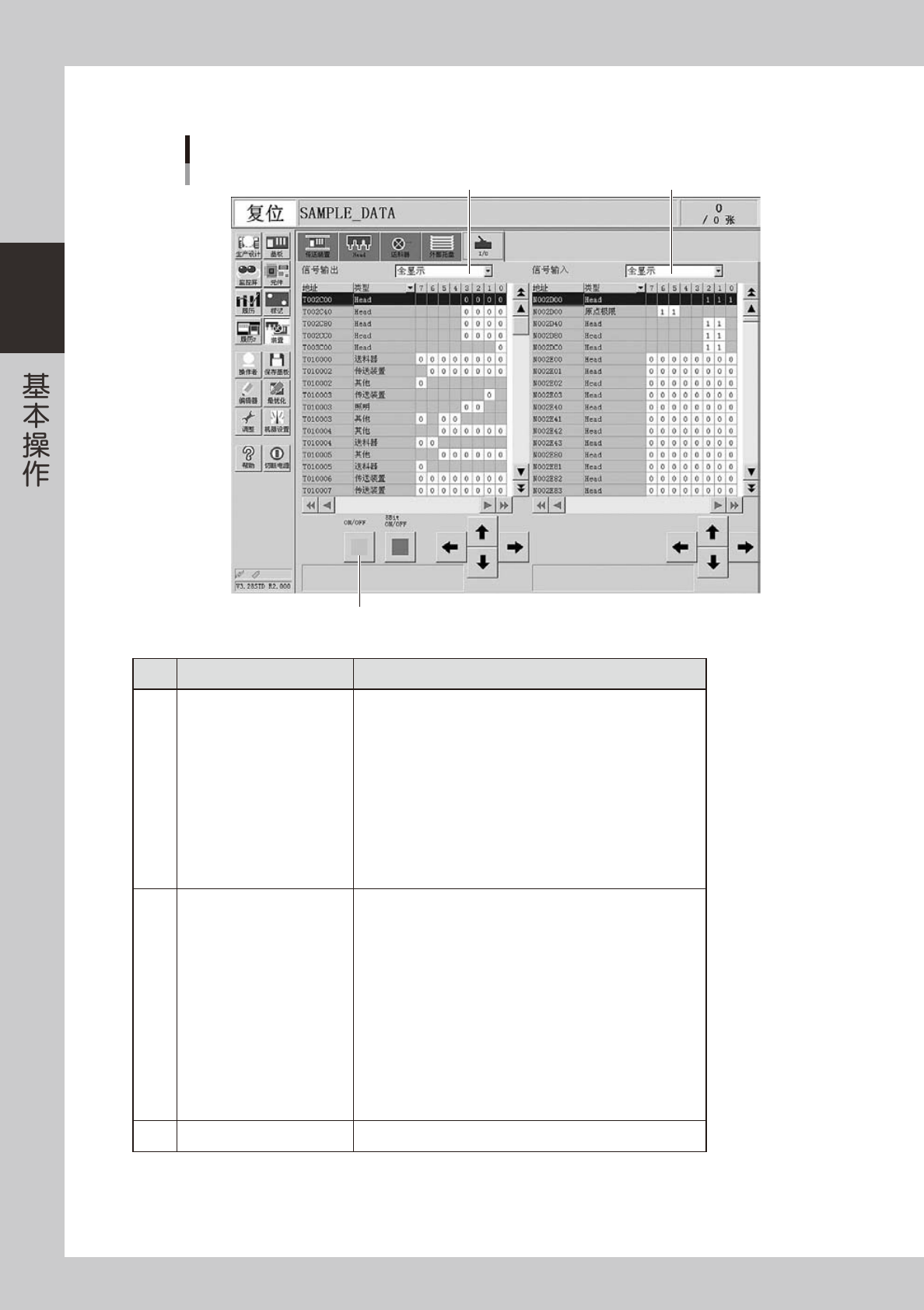 2-18 2 ■ I/O 手动操作 「装置」-「I/O」画面 1 2 3 26212-L1-00 名称 功能 1 「 信号 输 出 」下 拉 框 切 换信 号 输 出侧 的 显示 区 。 ‧ 送 料器 ‧ 吸 嘴交 换 站 ‧ 托 盘交 换 器 ‧ 照 明 ‧ 传 送装 置 ‧ Head ‧ 蜂 窝状 托 盘 ‧ BST A( 排 气站 ) ‧ AT S ‧ YTF ‧ 其 他 2 「 信号 输 入 」下 拉 框 切 换信 号 输 入侧…