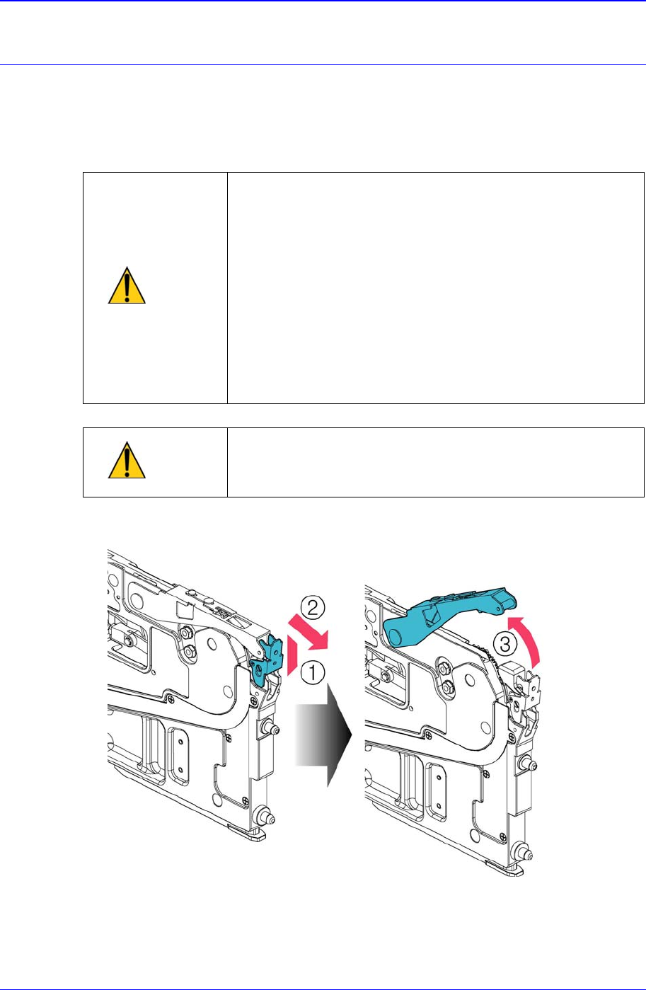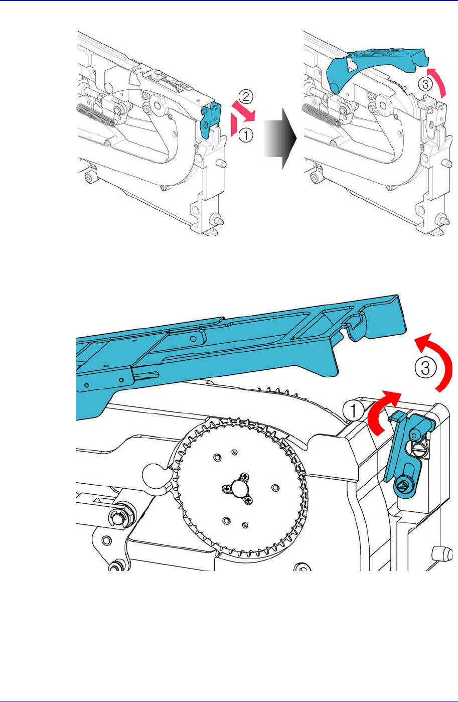 箭头方向 ① 拉起 ②旋转解除, ③向上抬起料带导轨打开锁夹。