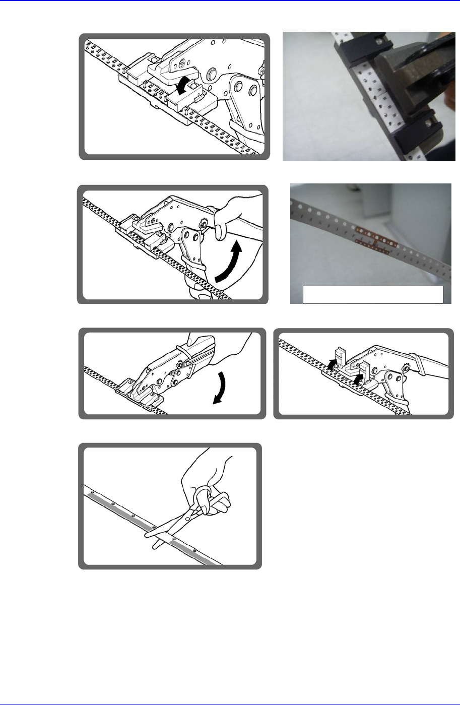带式喂料器的操作 2-27 2. 揭开连接的带塑料的初段要长一些 (2 mm) 。 3. 使 Burr 朝上,把 H- 型 Ti p 夹在 T ool 中。 4. 将使用中的带位于 H- 型 Ti p 上方后压下向下装置。 预先揭开塑料时 没有预先揭开塑料时 利用 T ool 揭开塑料