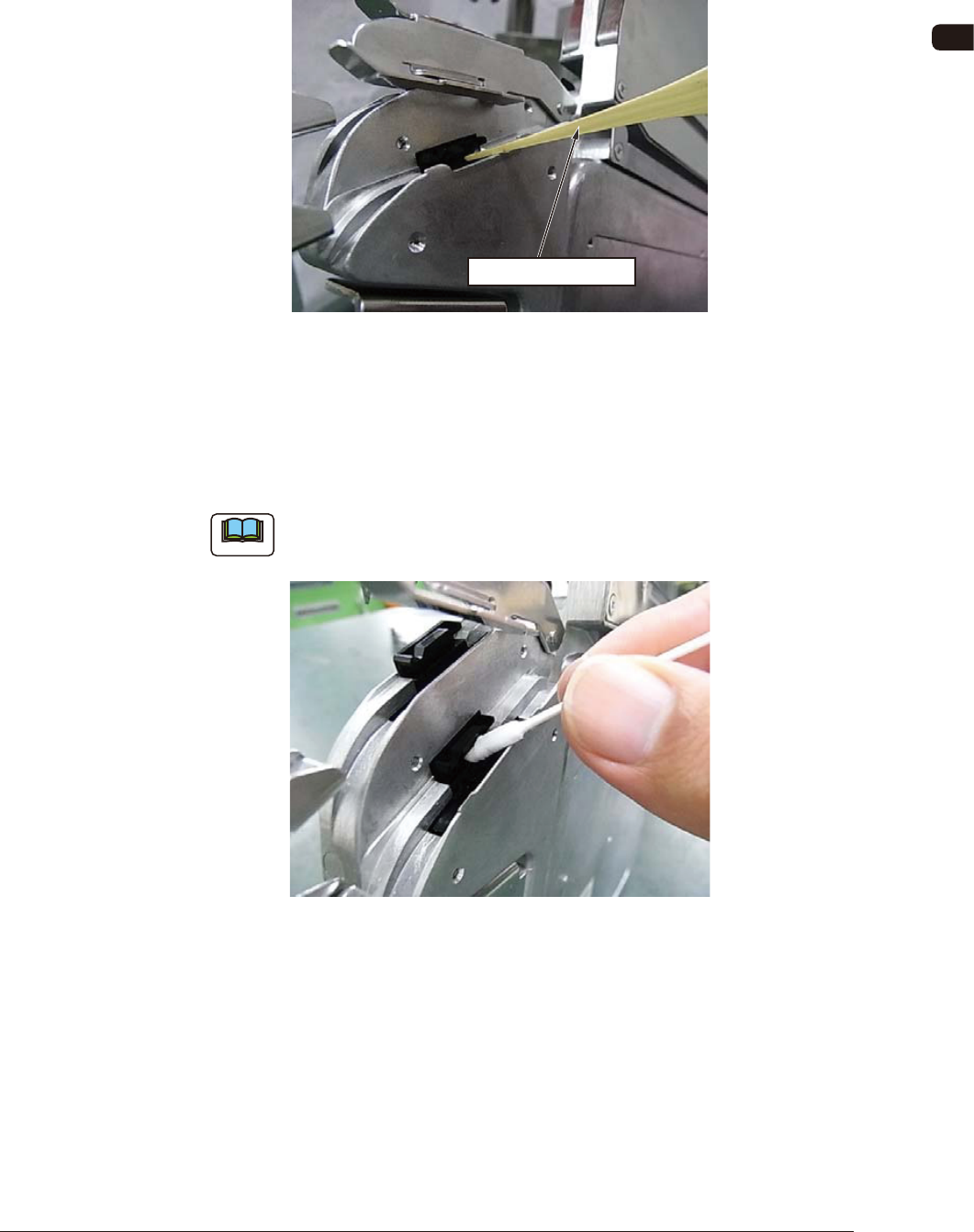 OM-1606 7-17 7. Maintenance (2) Clean the sensor section. • Debris Removal When any debris such as sticky substance, is stuck, rub it off using a bamboo probe. Sticky Substance FG21 • Wiping Dirt Off Insert a cotton appl…