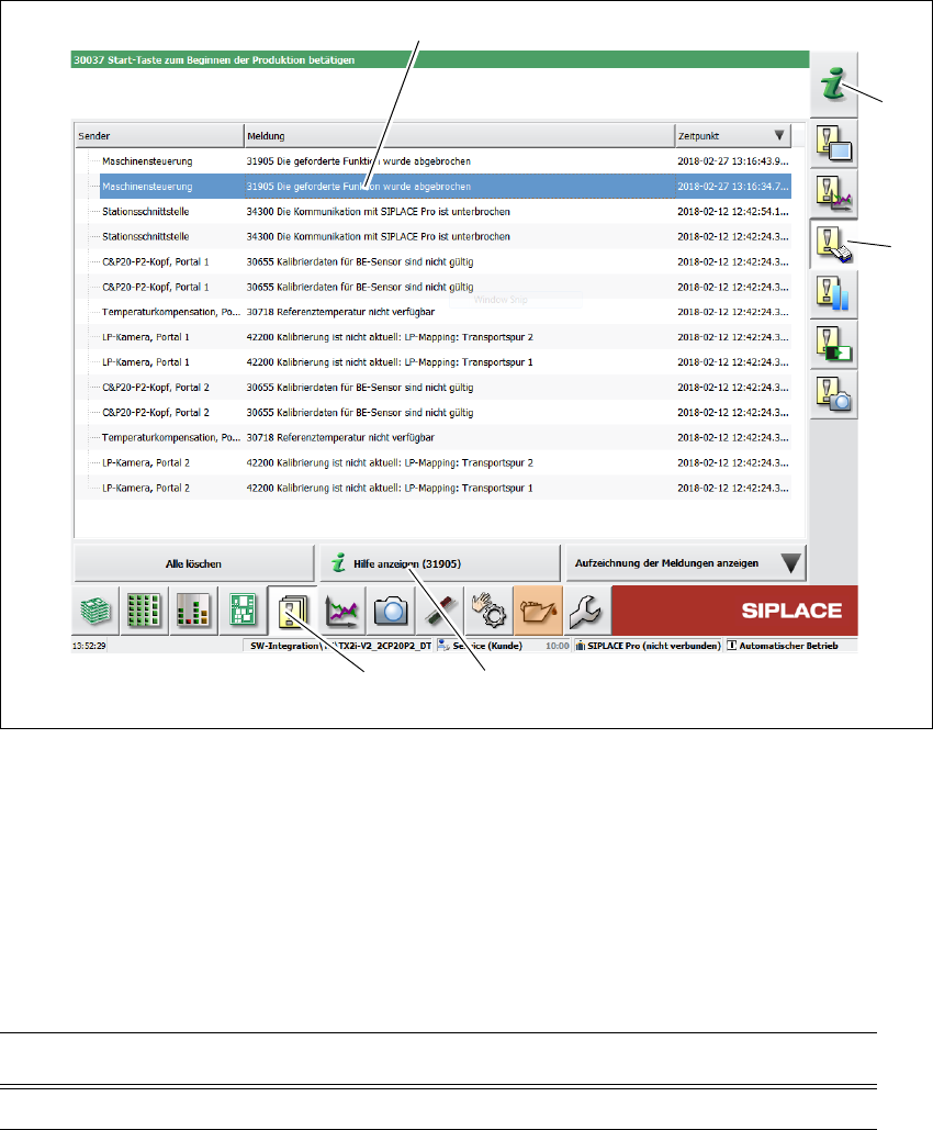 用户手册 SIPLACE TX 5 贴片机处的工作 使用软件版本 711.1 或更新 2018 年 4 月 5.6 警报信息和 “ 联机帮助 ” 213 5.6.4 上下文 “ 联机帮助 ” 要查看当前视图的相关信息,单 击 图标启动工作站计算机的 帮助系统 。 帮助系统 主窗口将 随着警报信息一起被打开。 此信息指的是当 前正在显示且启动了帮助功能的警报。 使用 “ 内容表 ”、“ 索引 ” 和 “ 搜索功能 ” 来查看 “ 联机帮助…