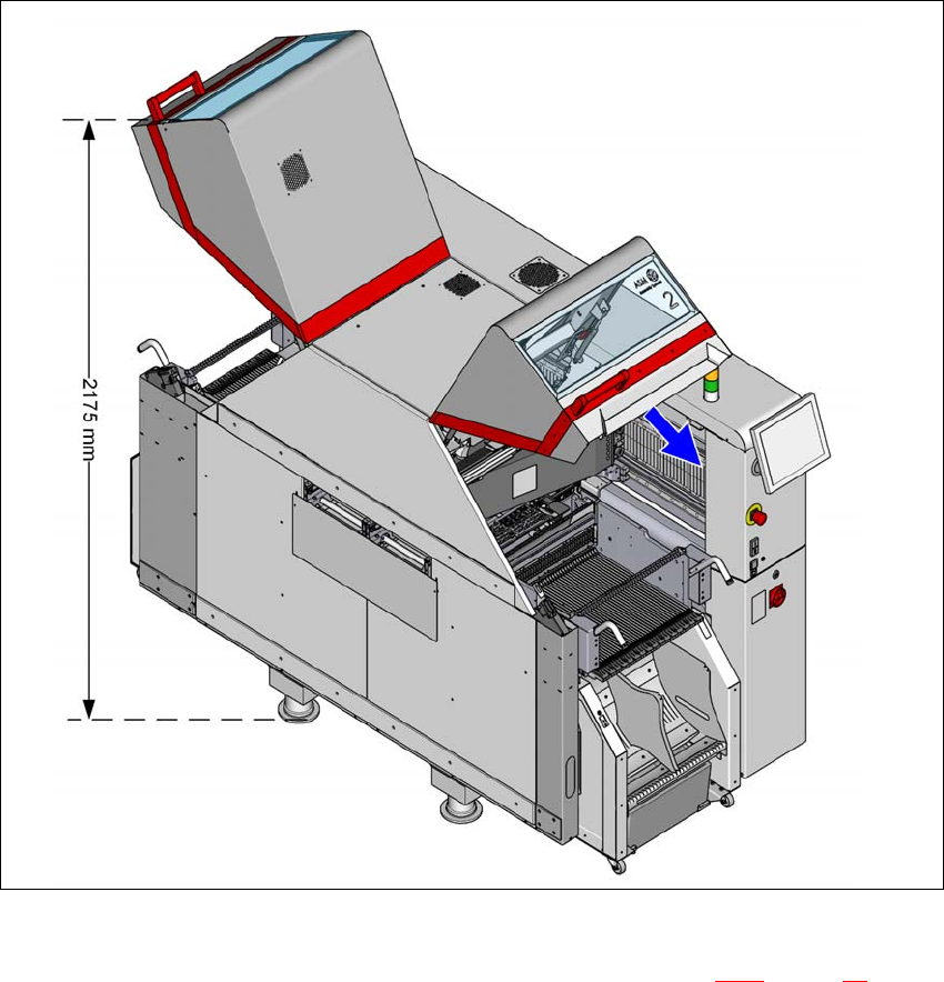 用户手册 SIPLACE TX 3 技术数据和组件 使用软件版本 711.1 或更新 2018 年 4 月 3.3 尺寸和重量 99 3.3.1.2 保护盖向上折起后的高度 3 图 3.3 - 2 保护盖向上折起后的高度 - 尺寸以毫米计 (显示的示例为 SIPLACE TX2) – 长保护盖向上折 起后呈 60 度角的 位置 (如需了解更多值,请参阅第 3.3.1 节,第 97 页 )。 所列尺寸为最大尺寸。 PCB 传送导轨高 度为…