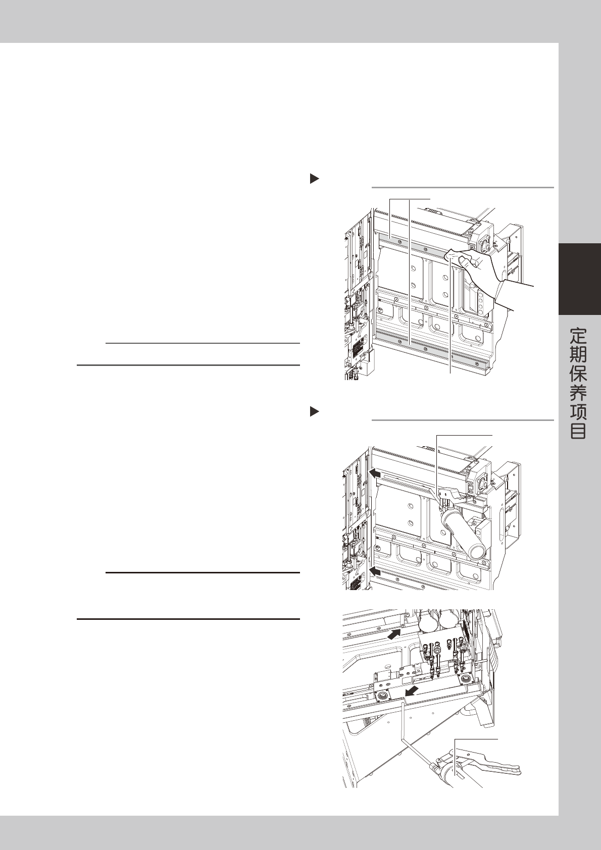 3-23 3 2.2.3 X 轴导轨的清洁与加油 (4 梁机型 ) 1 进行作业前的准备。 e 1. 将易受磁场影响的手表、ID 磁卡等随身物品全部取出。 2. 按下紧急停机按钮,使贴片机进入紧急停机状态。 3. 将料车从贴片机上卸下。 4. 将方巾垫在 Y 轴直线导轨部和顶板上。 2 擦拭导轨。 1. 用移动把手将贴装头移至一端。 2. 用无尘纸 ( 清洁室用 ) 等擦去导轨的脏污润滑 油和尘屑。 3. 再将贴装头移至另一端后,擦拭导…