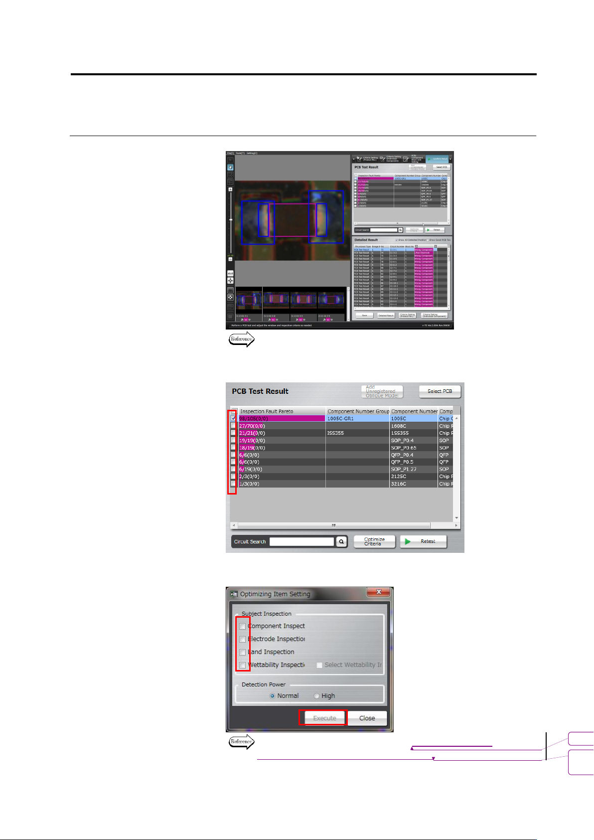 2.8 PCB Tes ting/Result Check 2- 101 3. Check the test result. Refer to the next page for how to interpret the test result. 4. Select the com ponent number check box and click [Optim ize Criteria]. The criteria optim iza…