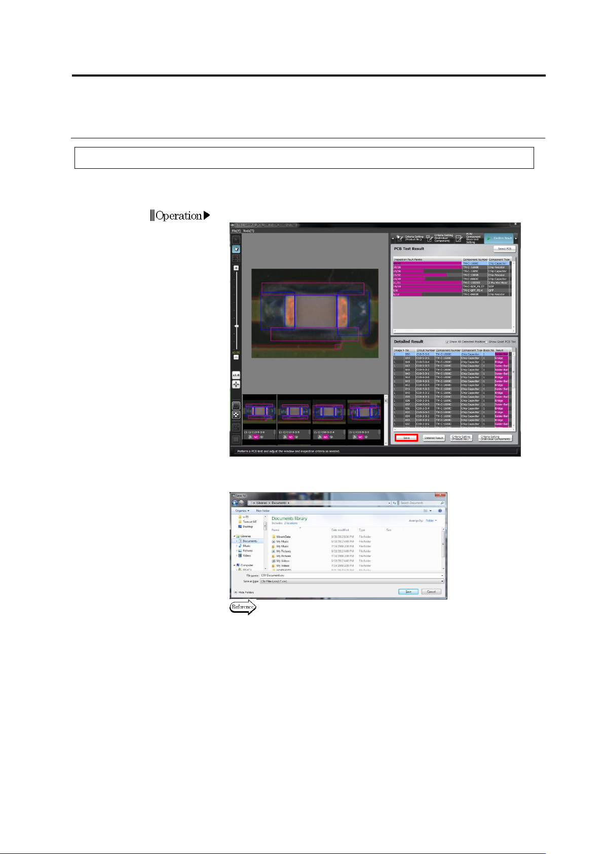 This section explains the procedure to save the PCB test result in the CSV format.