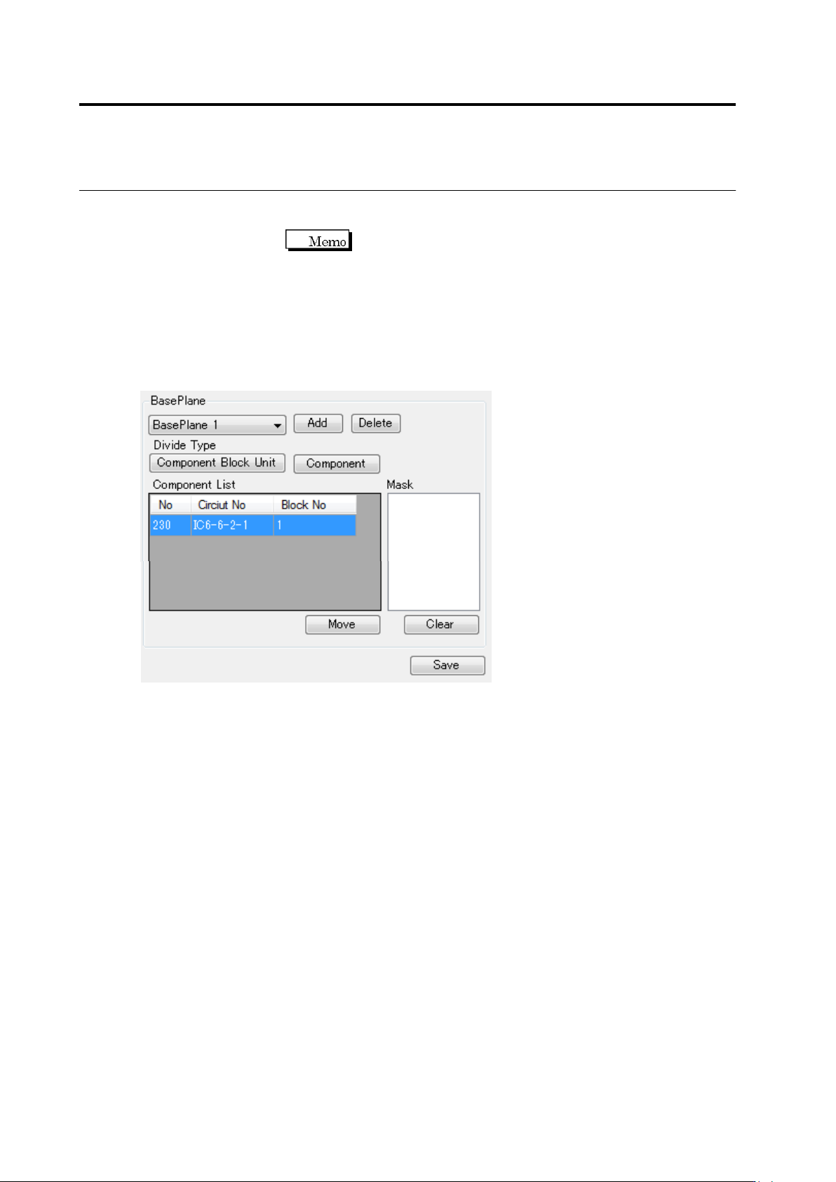 ⑱ Mask list : Displays the masks of the base plane selected by [BasePlane] in