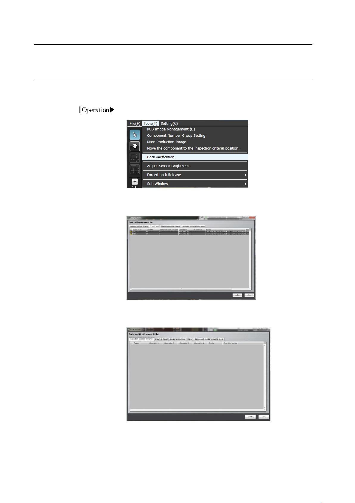 Chapter 2 Insp ection Progr amming 2- 226 You can manuall y perform data verif ication at an y timing . This section describes manual data verif ication s teps . 1. On the menu bar of the edit sc reen, select [Tool] - [D…