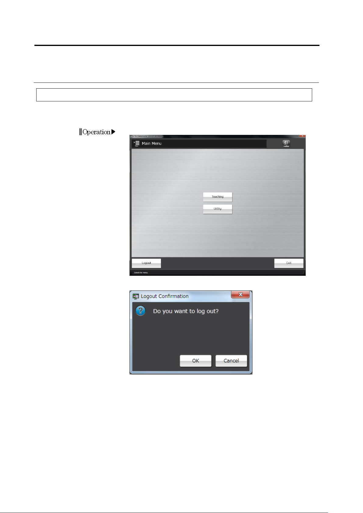 Chapter 1 Before Gett ing S tarted 1- 12 1.5.2 Logout The follow i ng logout procedures are u sed when teachin g operation is fin ished, or w hen the operator is changed 1. Click [Logo ut] on the main menu. 2. The Conf i…