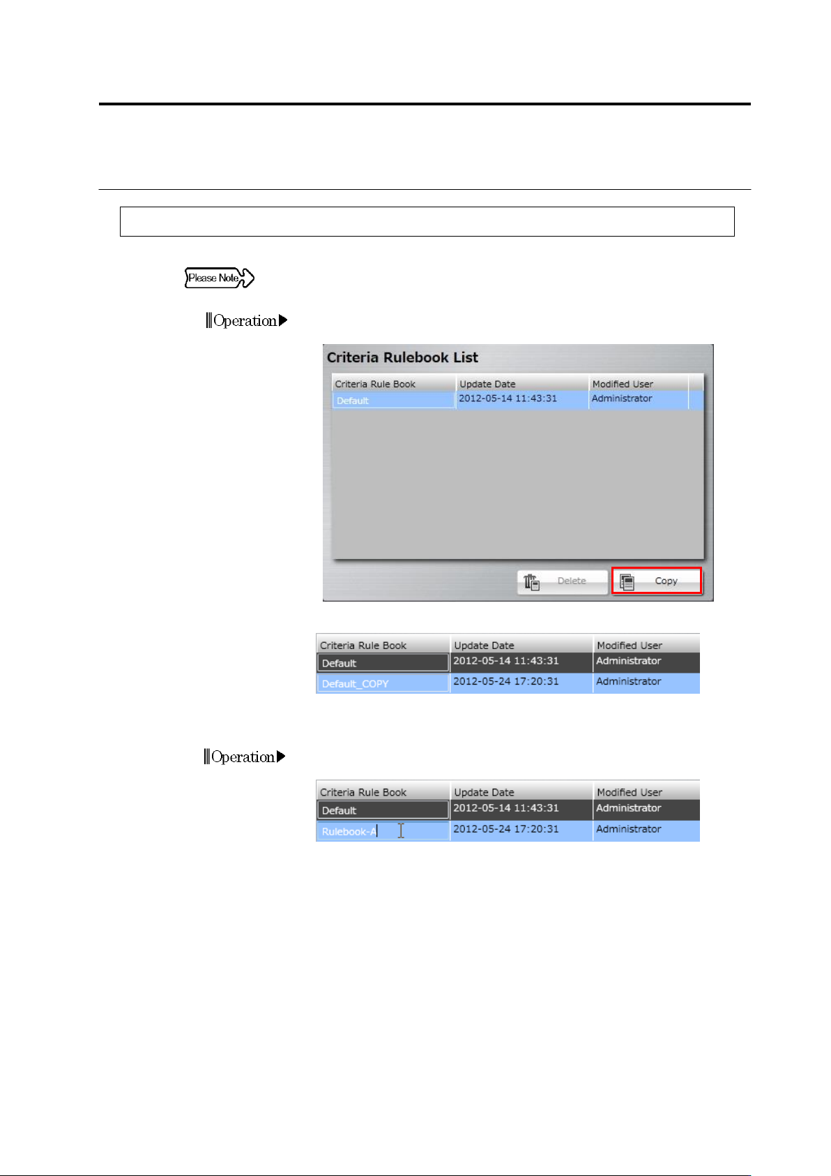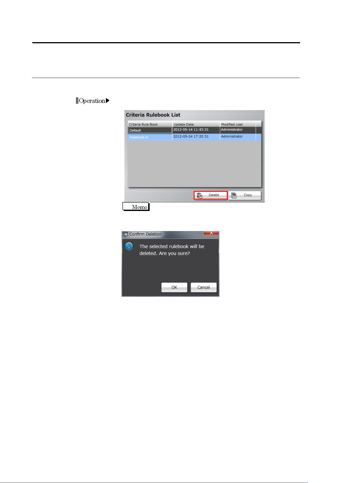 Chapter 3 Man agement Menu 3-6 Deleting Criteria Rulebook 1. Select a criteria rulebook from the criteria rulebook list, and c lick [Delete ]. If there is onl y one criteria rulebook, [Delete] will be invalid. 2. On th…