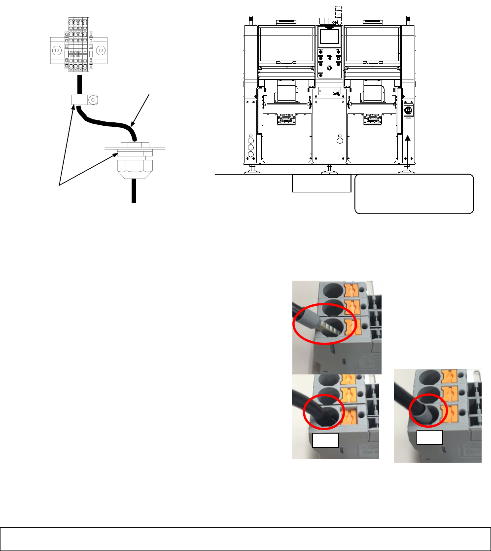 NPM-DX 2018.0601 - 101 - 12. ・ 电源 空气投入部 12.1 电源投入部 ■ 电源使用 4 芯电缆,是 3.5 mm 2 ~ 5.5 mm 2 范围的电缆,并且使用专用工具进行 连接。 ■ 如下左图所示,请采用在 2 处夹钳电缆的方法进行 配线。 1. 电缆外经尺寸 : φ 13.5 mm ~ φ 18.0 mm 2. 请必须用电缆夹具固定电缆 ,不使其被拖拉 (100 N) , 转动而发生移动。 ■ 端子台…