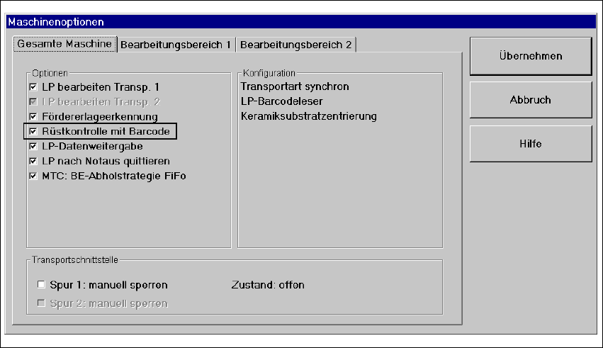 Abb. 7.6 - 1 Dialog: Maschinenoptionen - Rüstkontrolle mit Barcode