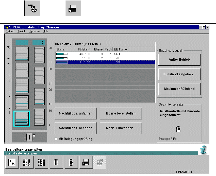 Die Software 504.01 wurde wie folgt angepasst: Turm 1 breiter und 5 Kassetten je 6 Ebenen. Die