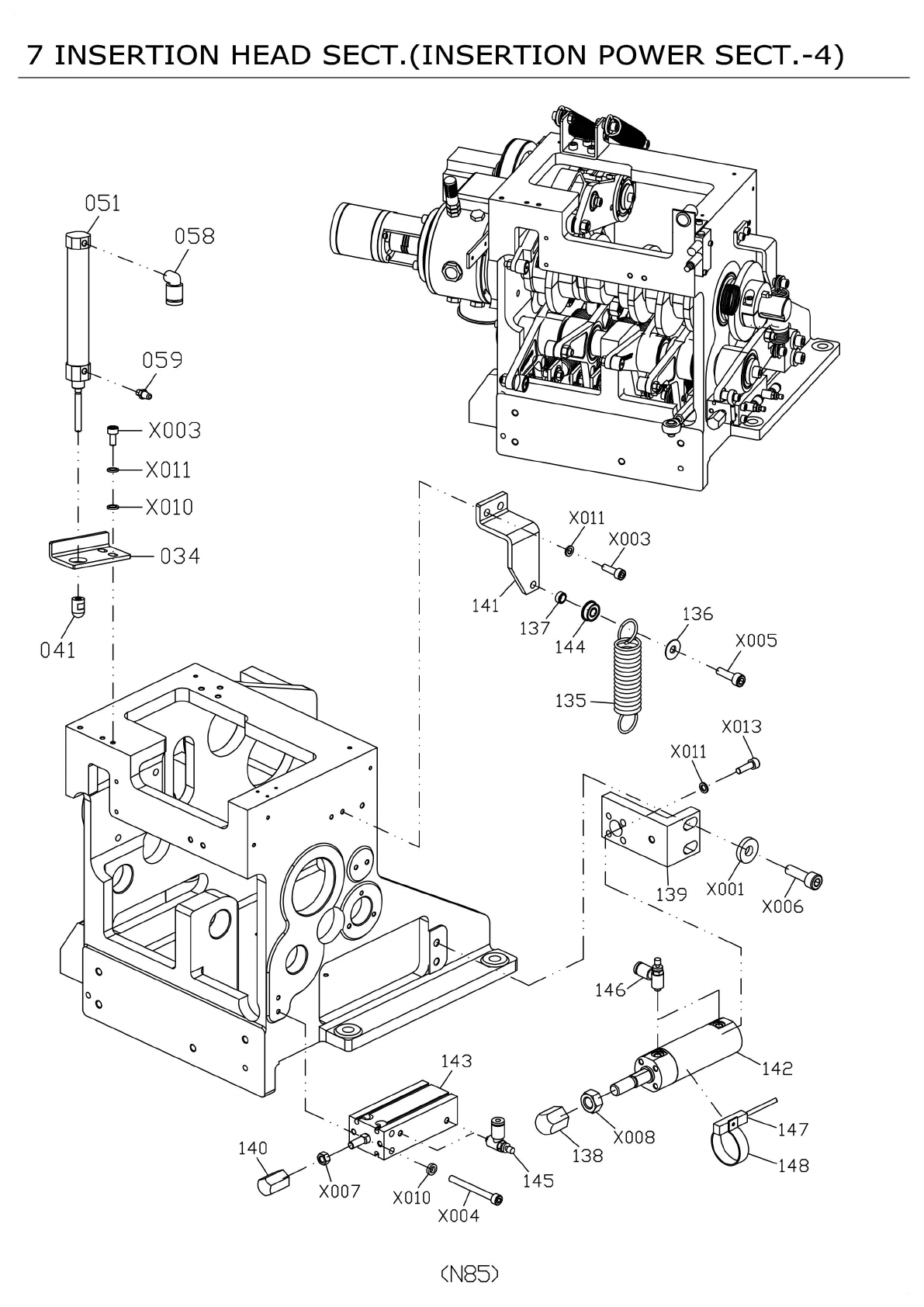 7 INSERTION HEAD SECT.(INSERTION POWER SECT.-4) 058 059 X003 r T X011 A 034 141 136 X005 041 135 0 X006 0 0 146 143 142 147 140 148 145 051 同 」 X010 1 QQ X001 137 144 X011 X003 X008 138 X0°7 X010 X004 X013 X011 (N85)