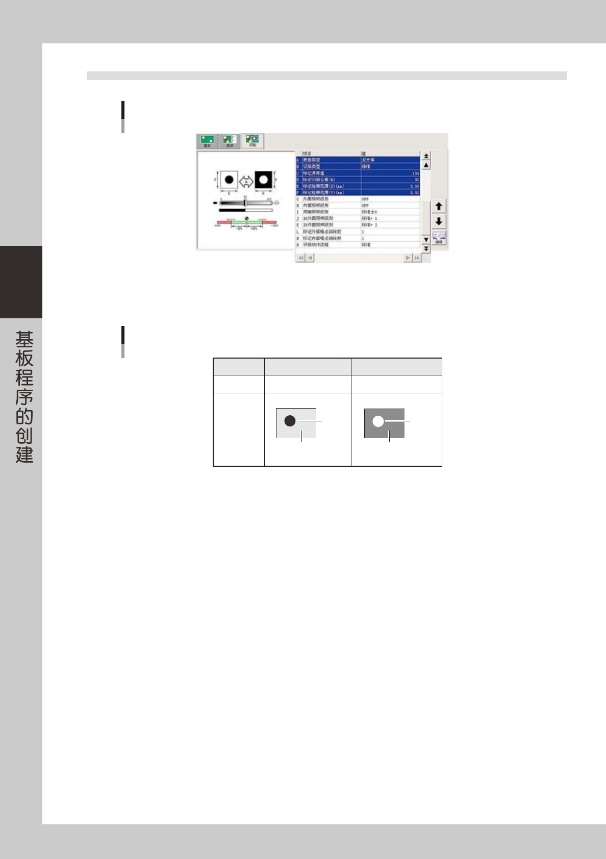 3-58 3 5.4 识别参数 识别参数 66336-F7-00 A: 表面类型 参考下表设置标记表面与基板 ( 标记周围 ) 的明暗关系。 非反光体 标记比基板暗 反光体 标记比基板亮 设 置 亮度比较 识别状态 基板 标记 基板 标记 表面类型 65339-N7-00 B: 识别类型 识别类型分以下 6 种。 · 标 准 除图样以外,所有的形状类型都使用此识别类型。但,此方法无法识别时,可以尝试使用其它识别方法。 · 特 殊…
