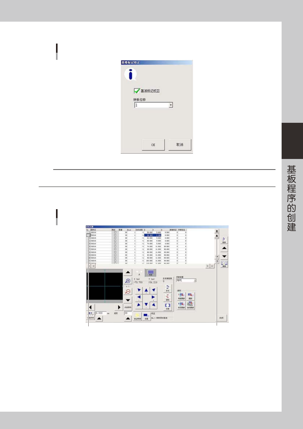 想要修改、添加或创建使用基准标记的基板程序时,如果勾选了“基准标记校正”选择框,则会自动识别基板的基准标记并获取校