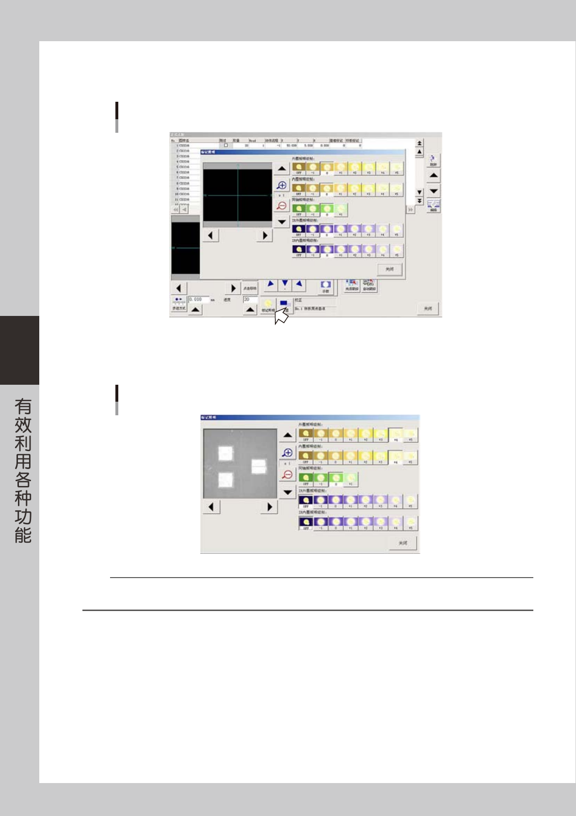 4-8 4 5 调节标记照明。 如果监控屏上没有显示目标物时,按 [ 标记照明 ] 按钮,调节照明级别。 打开“标记照明”画面 66408-N7-00 外圈照明级别与内圈照明级别为 OFF 或 0 时,改为 +4,确认监控屏上的目标物或标记。 同轴照明设置为 0。 照明级别的调整 66409-N7-00 参考 照明有“外圈照明级别” 、 “内圈照明级别” 、 “同轴照明级别”3 种。 “外圈照明级别” 、 “内圈照明级别” 、 “同轴照…