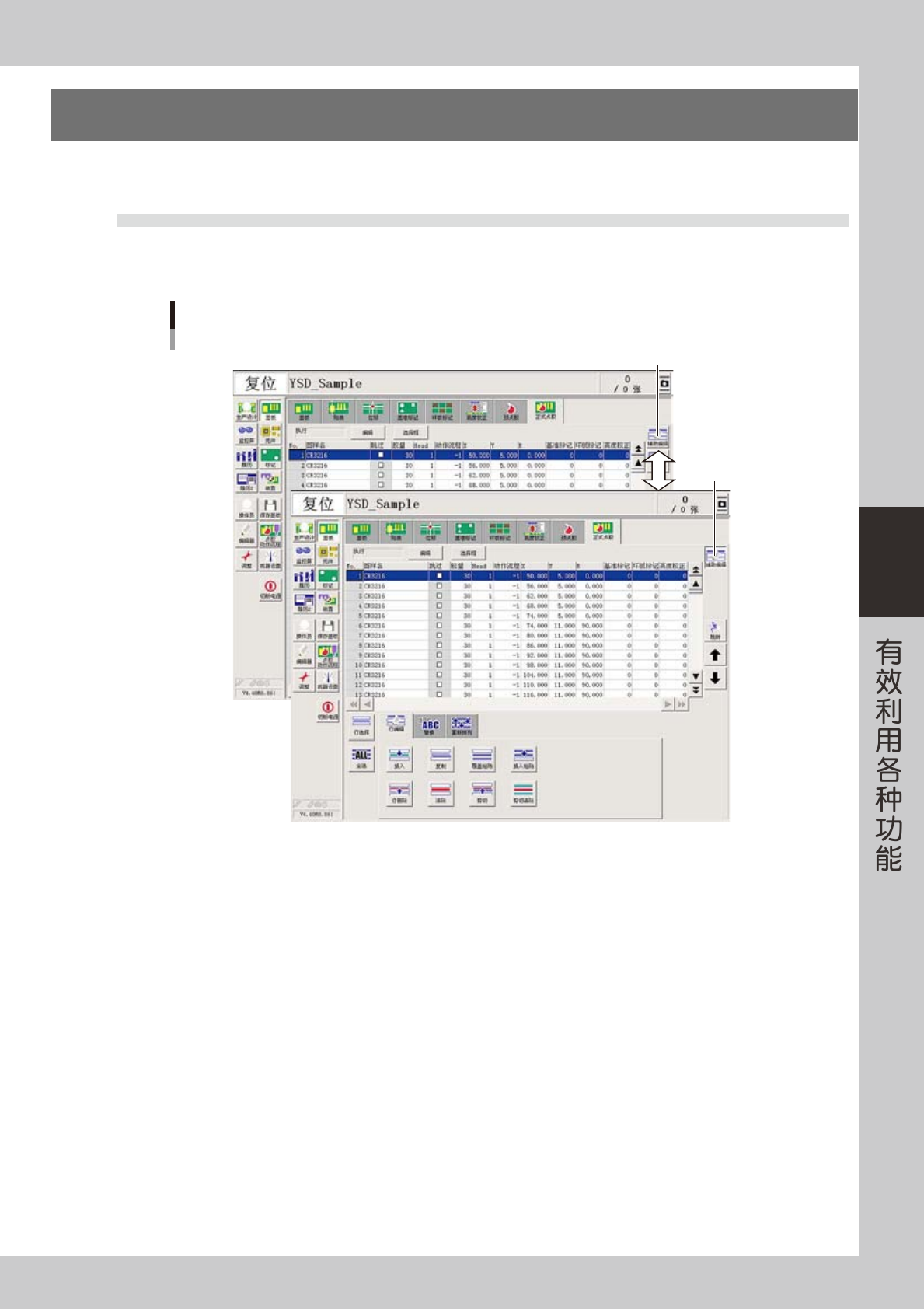 4-16 4 3.2 选择范围的指定 在表格中以行为单位指定选择范围时,使用 [ 行选择 ] 按钮和 [ 全选 ] 按钮。选定的行呈反色显示。 ■ 行选择 · 在 [ 行选择 ] 按钮没有下沉的状态下选择范围的开始位置。 · 接着按 [ 行选择 ] 按钮后点击选择范围的最终行,或按键盘的光标键,或用画面上的上下方向按钮调整选择范围。 · 点击下沉状态的 [ 行选择 ] 按钮后,退出行选择状态,选择范围即被解除。 没有下沉 下…