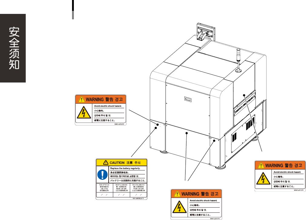 为了安全使用机器,如下图所示,在设备各个部位张贴了警告标贴,务必严格遵守标贴指示。此外,关于本节所