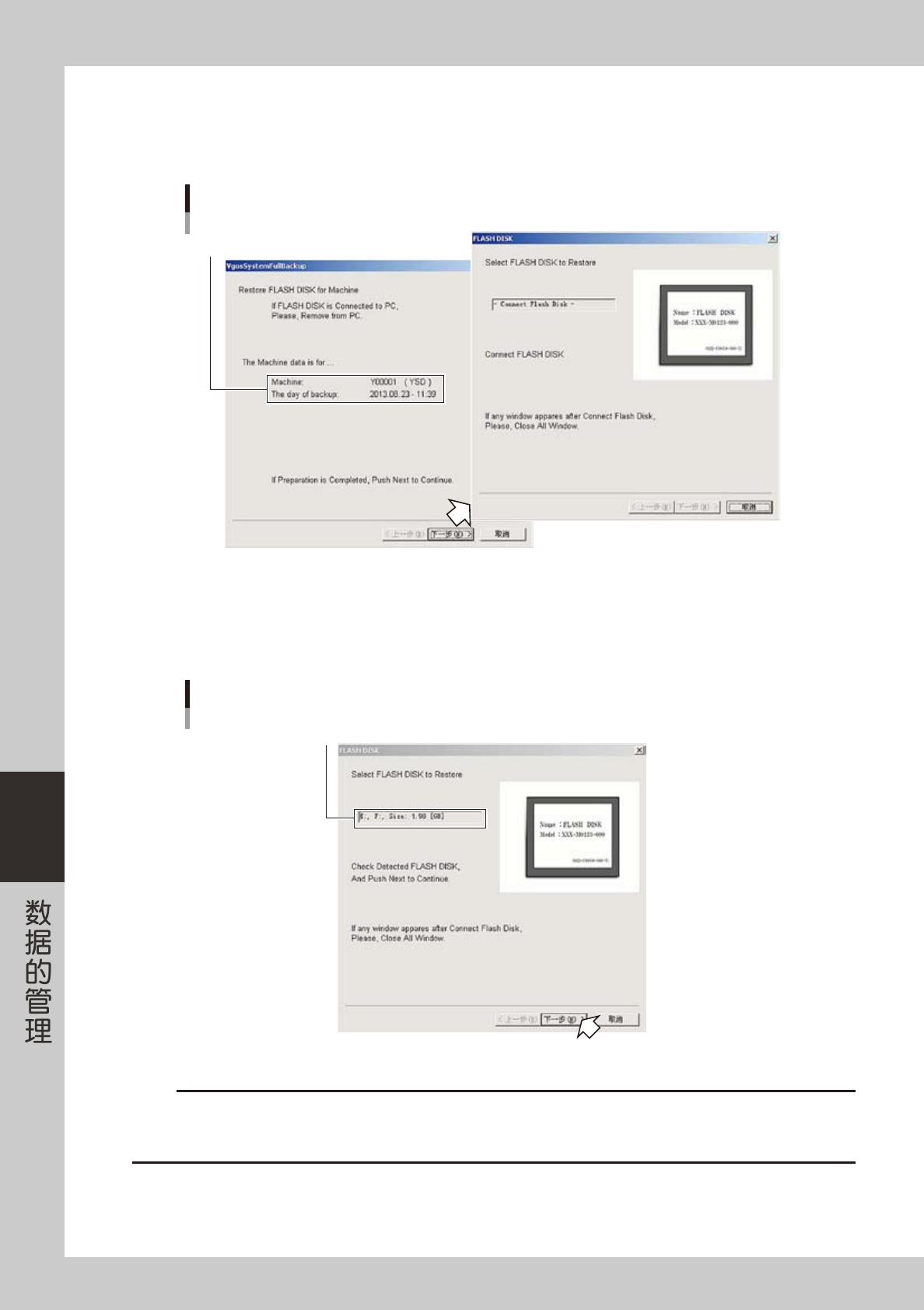 6-17 6 5 确认还原的设置并进行还原。 1. 显示“RESTORE”对话框后,确认闪盘所在的驱动器与系统全备份数据的保存路径是否正确。 2. 如果没有错误,勾选“Determine ( 确定 )”选择框。勾选后,画面上会显示 [Execute ( 执行 )] 按钮。 3. 点击 [Execute] 按钮,开始还原。 确认还原的设置与进行还原 闪盘所在的驱动器 系统全备份数据的保存路径 勾选“Determine (确定)”选择框 […