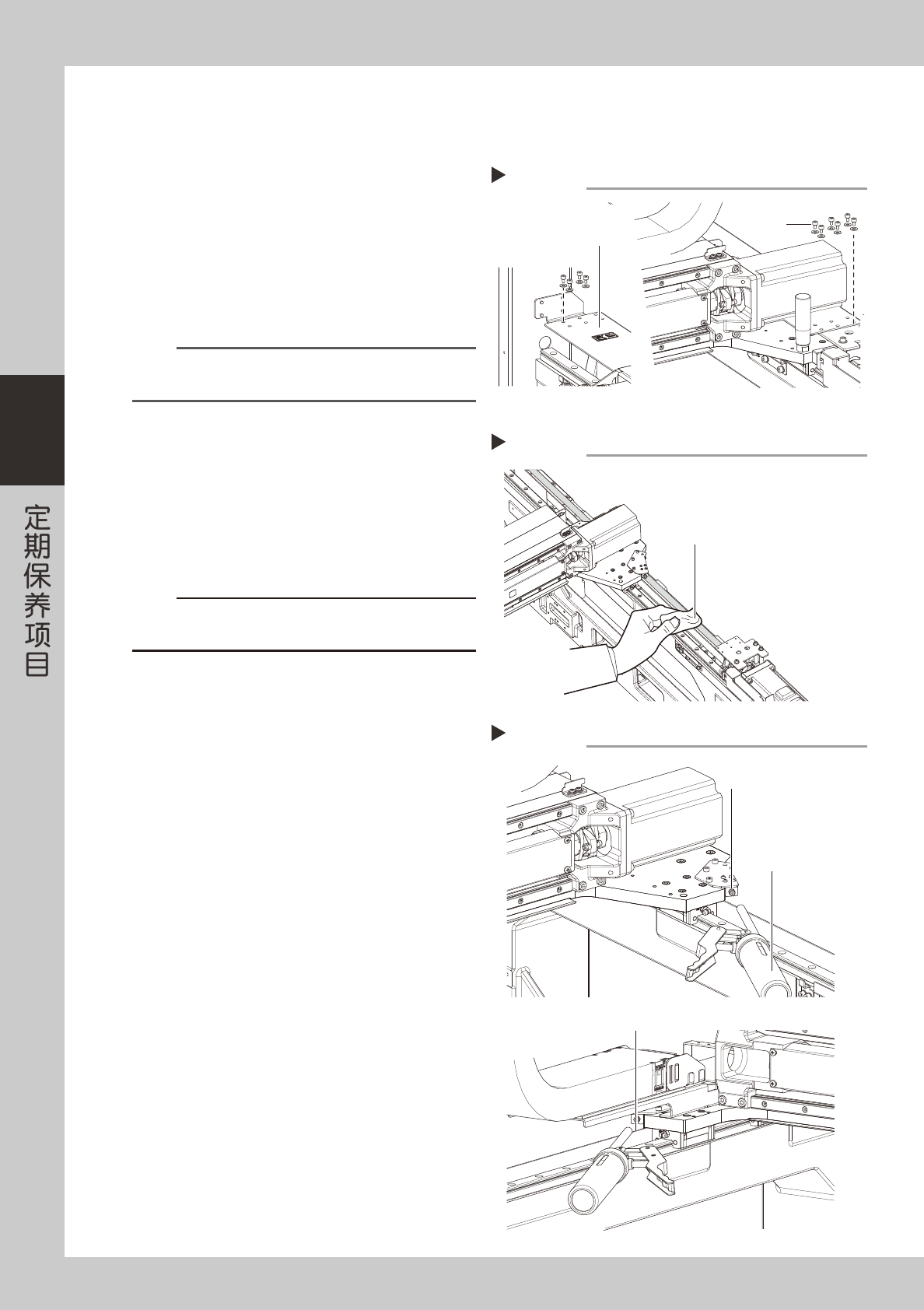 下面,介绍清洁 X、Y 轴滚珠丝杆、导轨的方法与加油的方法。关于加油位置与加油方式,请参阅第 5 章“加油位
