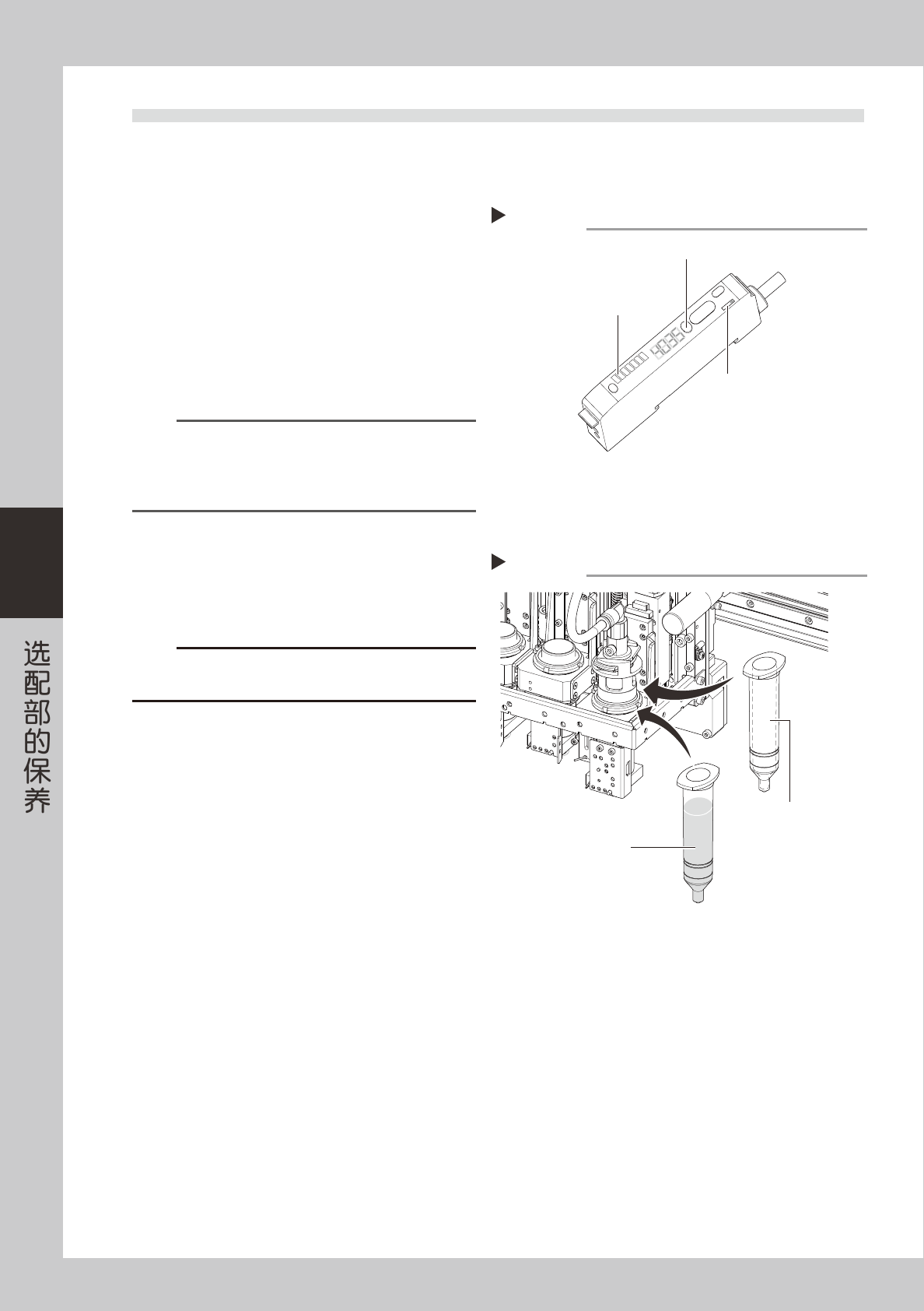 4-2 4 1.1 余量检测传感器的调整方法 e 1 按紧急停机按钮。 为保障作业安全, 务必将点胶机置于紧急停机状态。 2 确认放大器的信号输出设置。 将放大器的输出切换开关设置为“L_ON” ,使余量 检测传感器检测到胶筒的反光时为 ON。 55401-N7-00 3 调整无贴片胶状态时的感应级别。 1. 将空胶筒安装在点胶头部。 2. 确认传感器的光轴在空胶筒内活塞上方 5mm 左 右的位置。 n 要点 安装胶筒的筒架有 4 个…