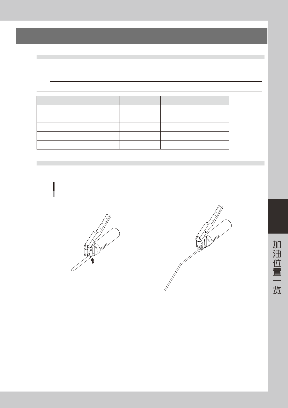 加润滑油时使用润滑油枪。请根据加油位置,选择适用的枪嘴。