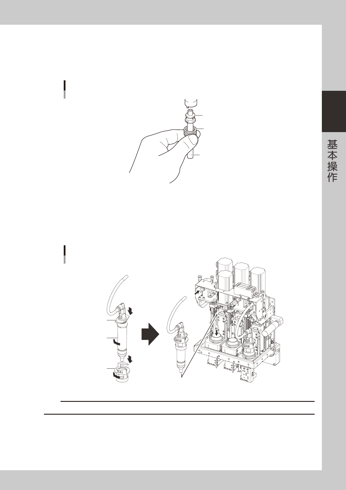 2-12 2 3.3 点胶头部的安装 下面,介绍点胶头部的安装方法与点胶状态的方法。 1 按生产设计画面的 [ 更换胶筒 ] 按钮。 打开“更换胶筒”画面。 2 移动点胶头。 按 [ 移至更换位置 ] 按钮,移动点胶头 参考 也可以按下紧急停机按钮之后,用手移动点胶头。 移动点胶头 66205-N7-00 3 确认点胶嘴的类型。 确认准备安装的点胶嘴是否是生产中将要使用的点胶嘴。 e 4 按紧急停机按钮。 按操作面板上的紧急停机按钮,使…