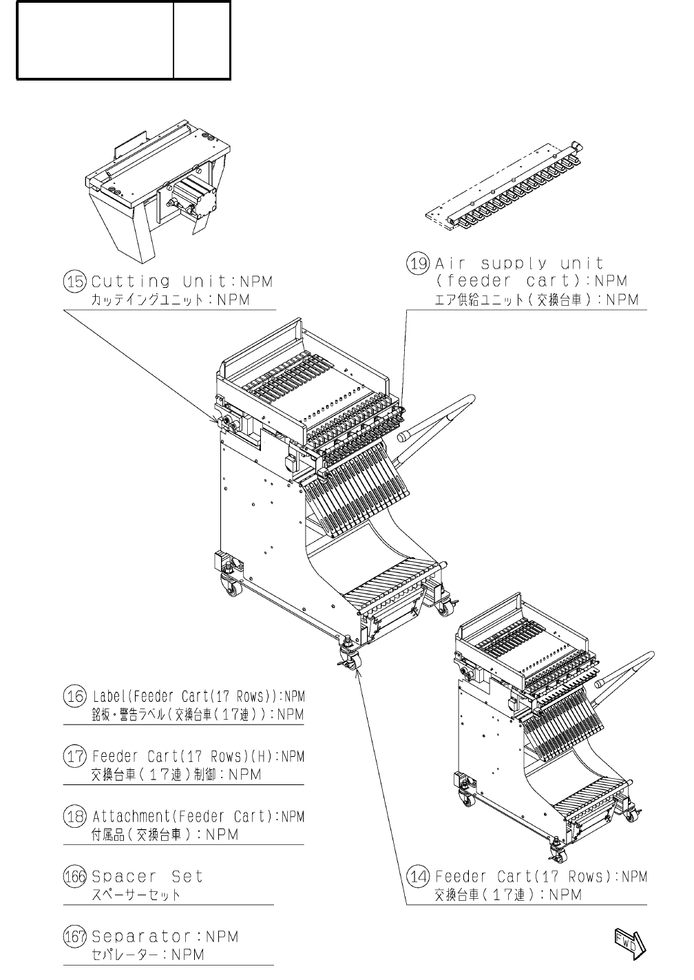 5 キットリスト KIT LIST Kit Name 番号 Part No. キット名 品 番 No. Rank Q'ty 数量 ランク 頁 Page 14 N610060938AB Feeder Cart(17 Rows):NPM 交換台車(1 7連):NPM 1 O69 15 N610073094AA Cutting U nit:NPM カッテイングユニット:NPM 1 O77 16 N610084837AA Label(…