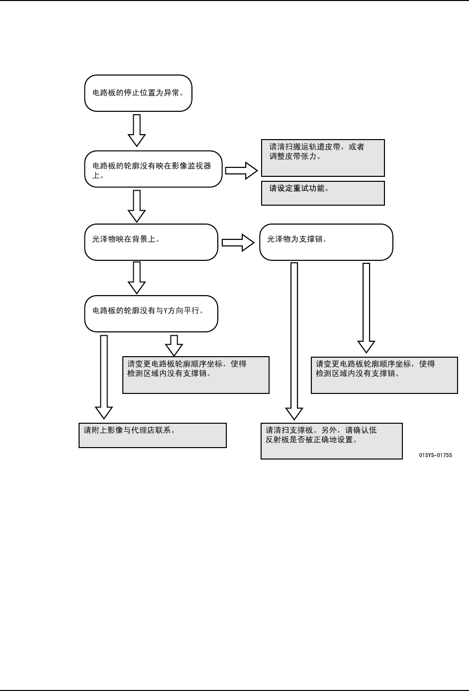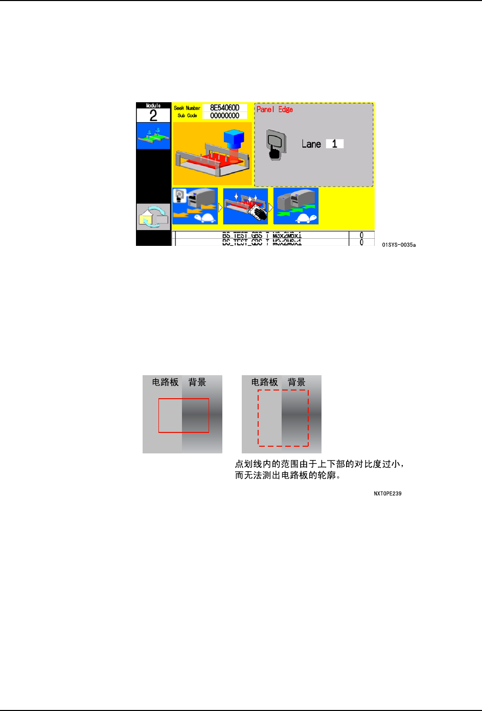 QD142-09 4. 生产 NXT II 系统手册 151 使用电路板停止位置补正功能时的异常 说明在使用电路板停止位置补正 功能时所发生的异常及其对策。 电路板轮廓的测出失败时 操作画面上显示异常向导。 a. 请按下 OK 按钮,拉出模组。 b. 请擦去附着在对象通道的低反射板上的污 垢,然后插入模组。 另外,当按下 MONITOR 按钮后,就能够确 认影像的状态。比较 电路板与背景 (低反射板) , 如果有对比度小的部分时,请按 …
