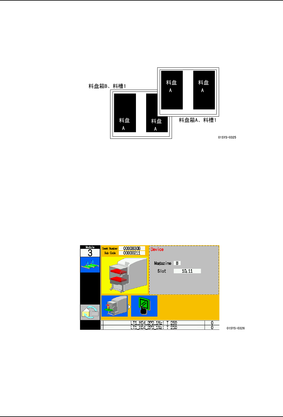 3. 正在向补充用料盘箱补充料盘时,如果生产用料盘箱中发生补件极限时,就会在操作画