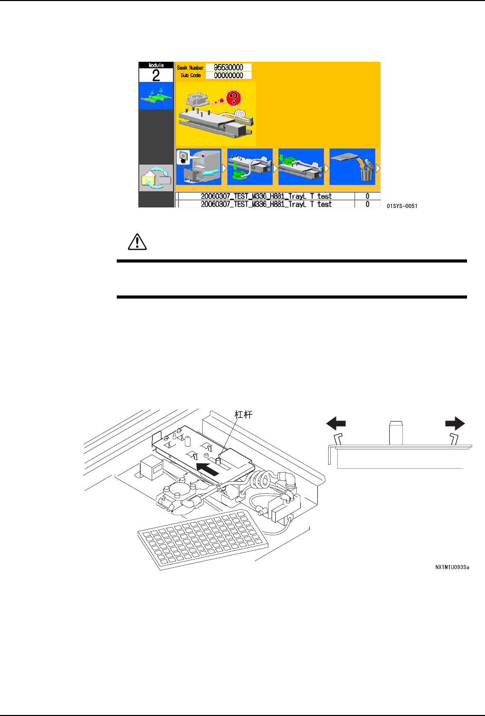4. 生产 QD142-09 190 NXT II 系统手册 找不到吸取器。 如果吸取器既不在工作头上也不 在吸取器站上,在操作画面上显示 异常向导。 a. 请打开机器的侧罩, 确认吸取器 的位置。 确认不存在拉出料盘单元时气管被卡住等的 问题。 b. 按下操作面板的 OK 按钮,松开料盘单元。 c. 请慢慢地拉出料盘单元。 d. 请按下杠杆,打开吸取器固定用的爪。 警告 在拉出料盘单元之前,请打开机器 的侧罩确认吸取器的位置。在吸取 …