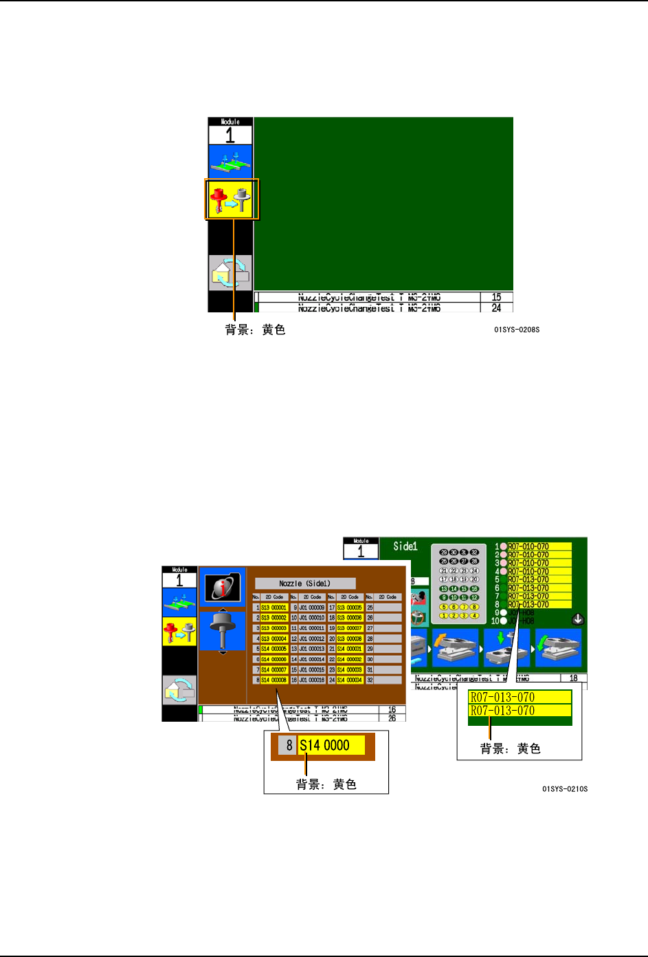 备注 )在手动模式的信息指令及换线时的安装向导中,被切换的吸嘴的代码或别名以黄色的