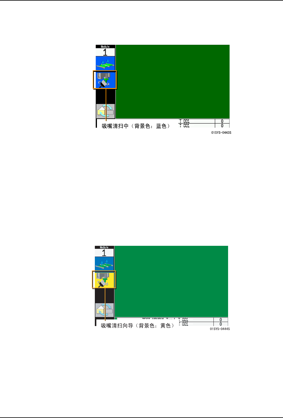 2. 当完成清扫后,机器就会重新开始生产。同时,吸嘴清扫中的示意图从画面上消失。