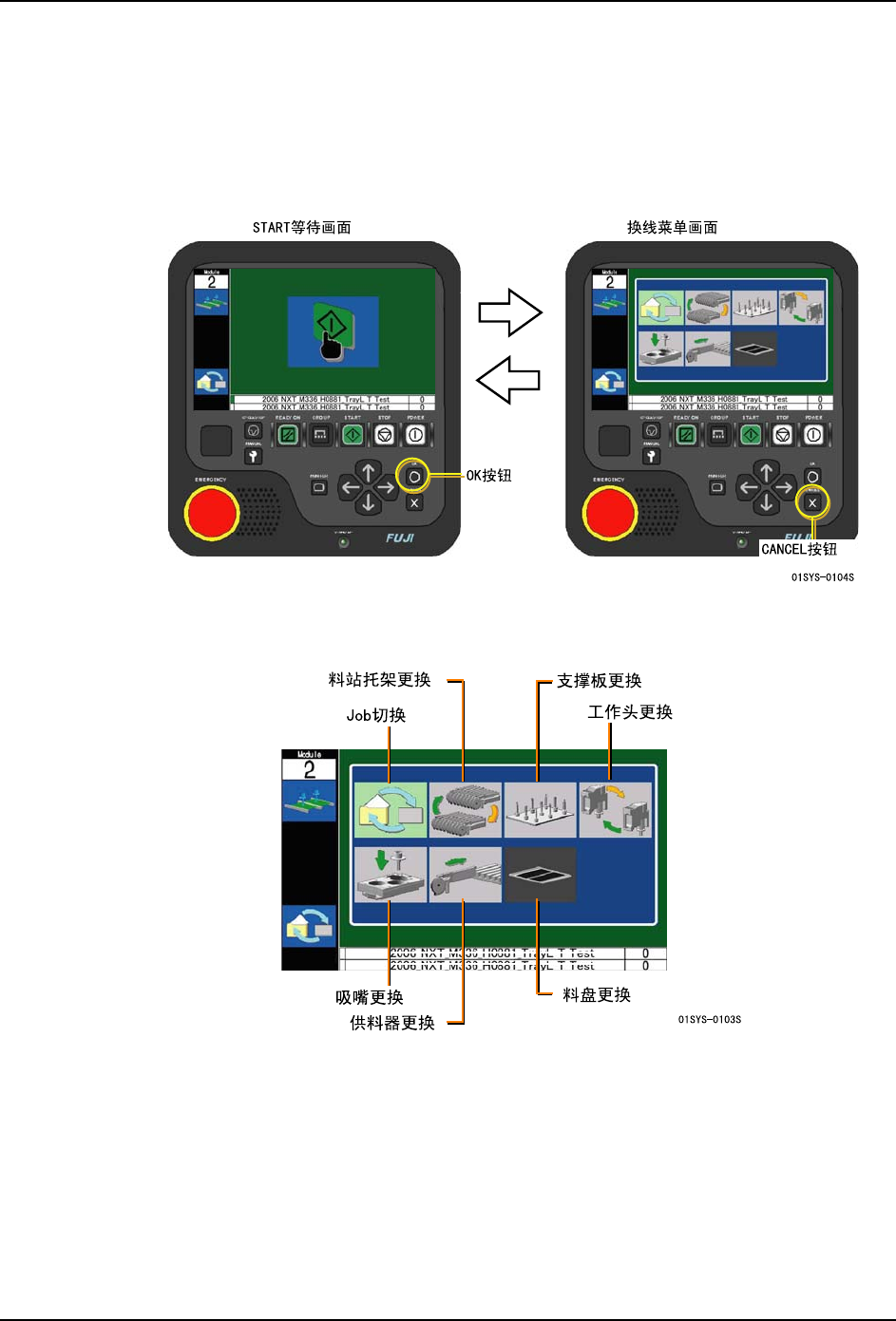 此时,在 START 等待画面上请按下 OK 按钮,切换到换线菜单画面。当按下 CANCEL 按钮后就
