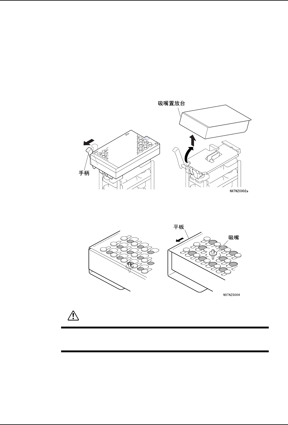 2. 将吸嘴置放台的手柄向模组前方倾斜,把置放台的前半部分向上抬起并卸下。