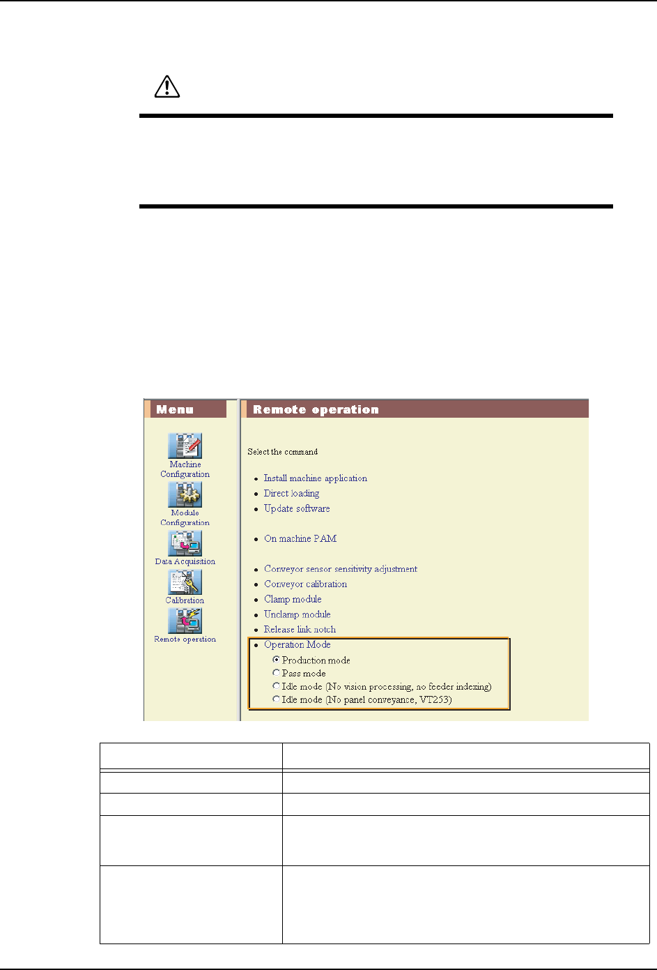 QD142-09 7. 辅助软件 NXT II 系统手册 373 在进行下述操作前,请务必进行 安全确认。 1. 选择要夹紧的模组,单击 [ 远程操作 ]。 2. 单 击 [ 模组的夹 紧 ]。 3. 在安全确认了模组后方没有人员后,单 击 [ 开始 ],模组就会被夹紧 。 7.14.5 生产模式设定 生产模式存在 4 种模式。 警告 模组在插入到基座时,请确认模 组后面没有人。模组与基座之间有 可能压 着身体和手指而受伤。 在拉出和插…
