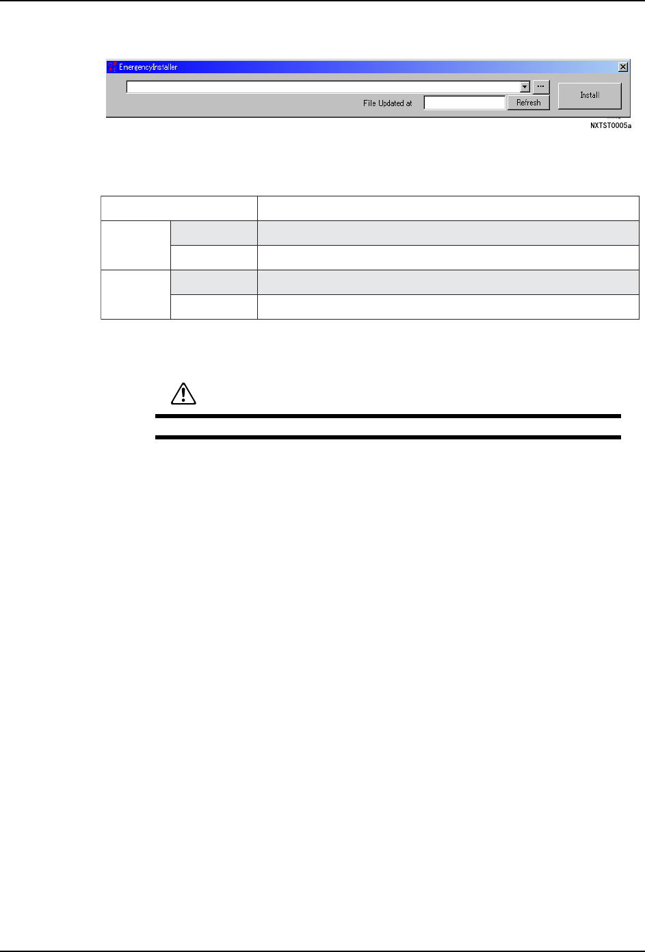8. NXT-2 软件工具 QD142-09 388 NXT II 系统手册 10.双击 Emergen cyInstaller.exe,启动 软件。 11.单击 [...],选择版本更新项目的 bin 文件 (根据机器所选择的 文件会不同。请参照下 表。 )选择版本更新的单元的文件 后单击 [ 打开 ] 时,路径和文件显示在文本 框内。 备注 )此处,请选择 (*1)的文件。 12.单击 [ 安装 ] 后,将文件安装到 对象 CPU …