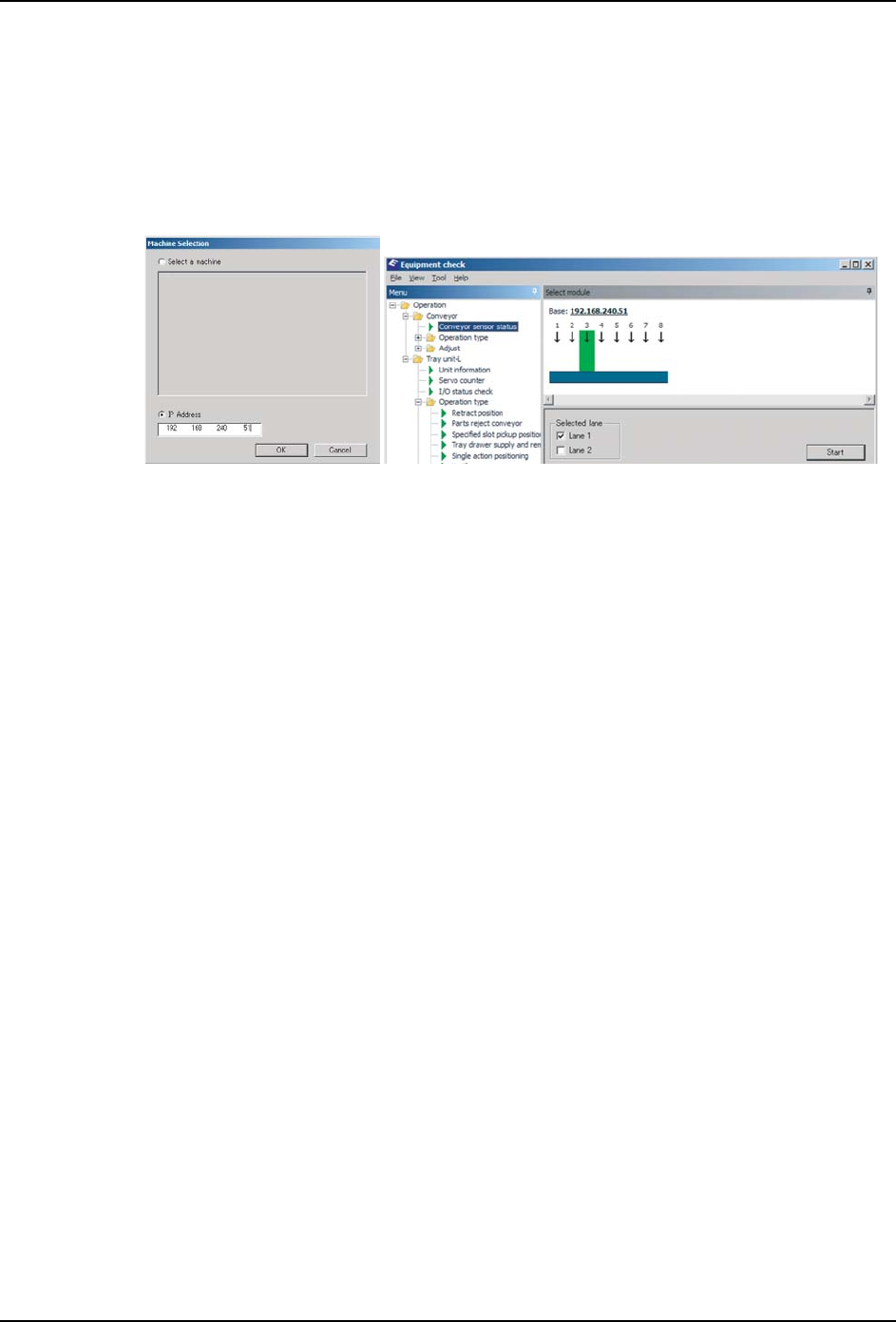首先,在 [ 机器选择对话框 ] 内指定对象机器(基座)的 IP 地址。接着,从 EquipCheck 窗