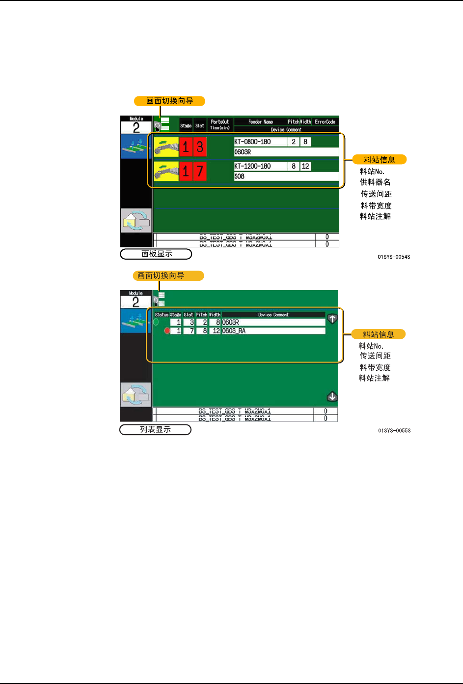 在 [ 列表显示 ] 画面上,能够知道安装更换供料器的场所。按上下键(箭头键),画面就会