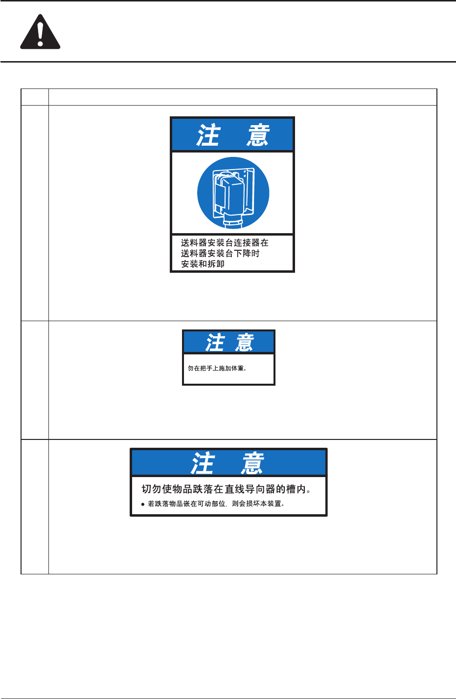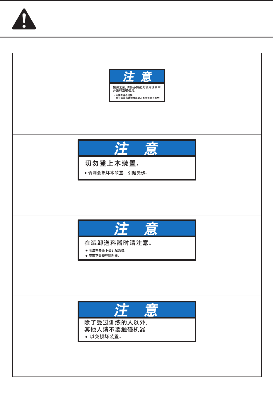 安全 - 28 0602 - 004 No. 警告标签及其说明 (20) 说 明 使用装置前,请务必熟读此使用说明书,并进行正确使用。 如果操作错误,就会造成装置故障或者受伤等重大事故。 (21) 说 明 请勿登上本装置。 以免损坏装置或从装置上跌落而受伤。 (22) 说 明 请使用双手谨慎进行送料器的装卸动作。 以免送料器掉落造成受伤或损坏送料器。 (23) 说 明 除了装置运行操作人员或受过训练的人以外,其他人请不要…